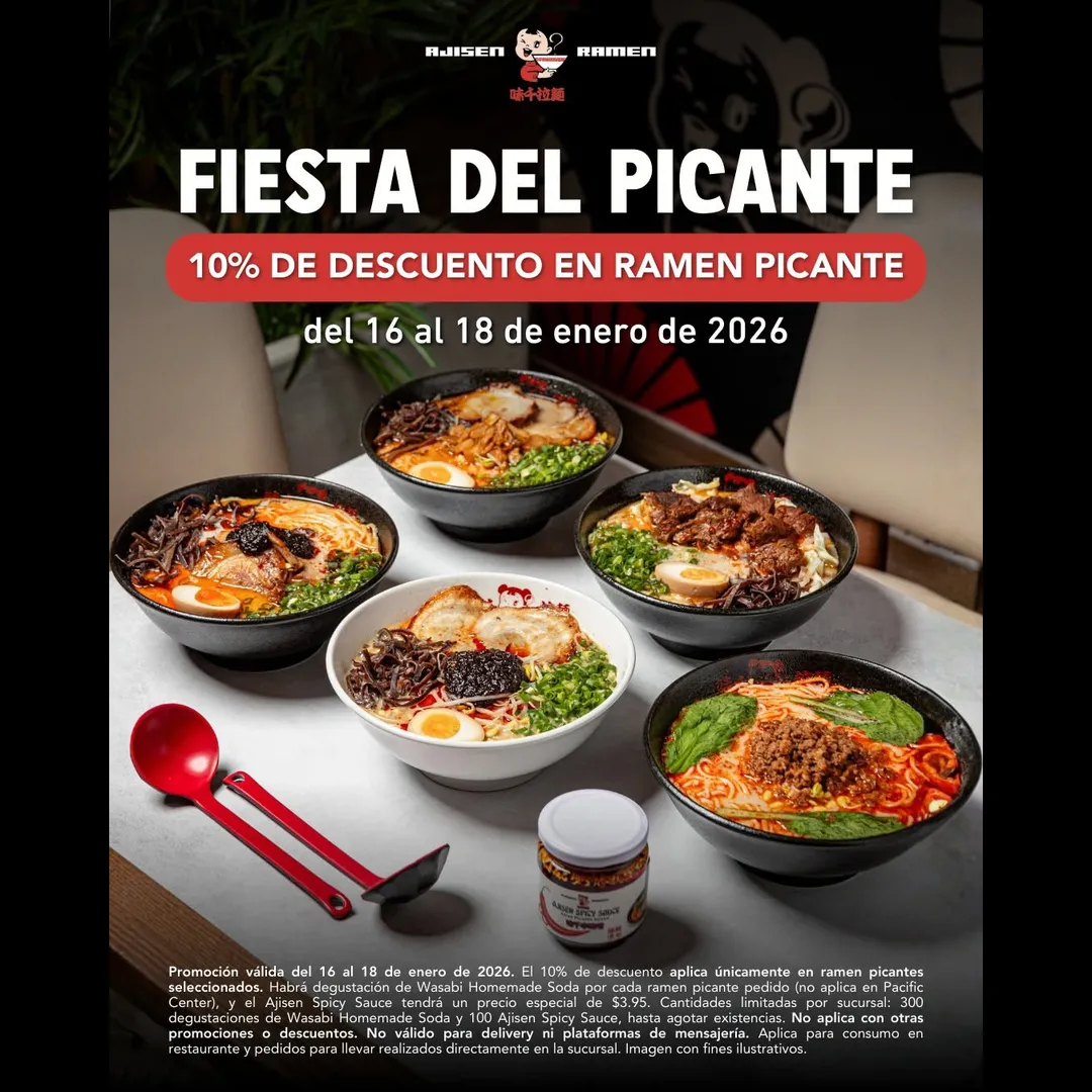Promoción válida del 16 al 18 de enero de 2026. Aplica 10% de descuento únicamente en ramen picantes seleccionados. Incluye una (1) degustación de Wasabi Homemade Soda por cada ramen picante pedido, no aplica en la sucursal de Pacific Center. Durante los días de la promoción, Ajisen Spicy tendrá un precio especial de $3.95. Cantidades limitadas por sucursal: 300 degustaciones de Wasabi Homemade Soda y 100 Ajisen Spicy, hasta agotar existencias. No aplica con otras promociones o descuentos. No válido para delivery ni plataformas de mensajería. Aplica únicamente para consumo en restaurante y pedidos para llevar realizados directamente en la sucursal. Imagen con fines ilustrativos.