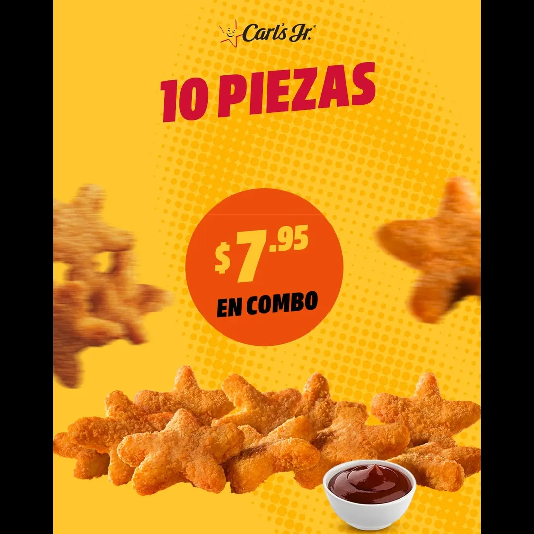 🌟 ¡Volvieron los que brillan con sabor propio! Regresaron los Chicken Stars de Carl’s Jr: crujientes, dorados y listos pa’ que comas en serio. Pídelos en combo pa’ ti solo o en versión grande pa’ compartir con tu combo de frenes, en opciones de 4, 6, 10 y 20 piezas, tú eliges!! 🙌