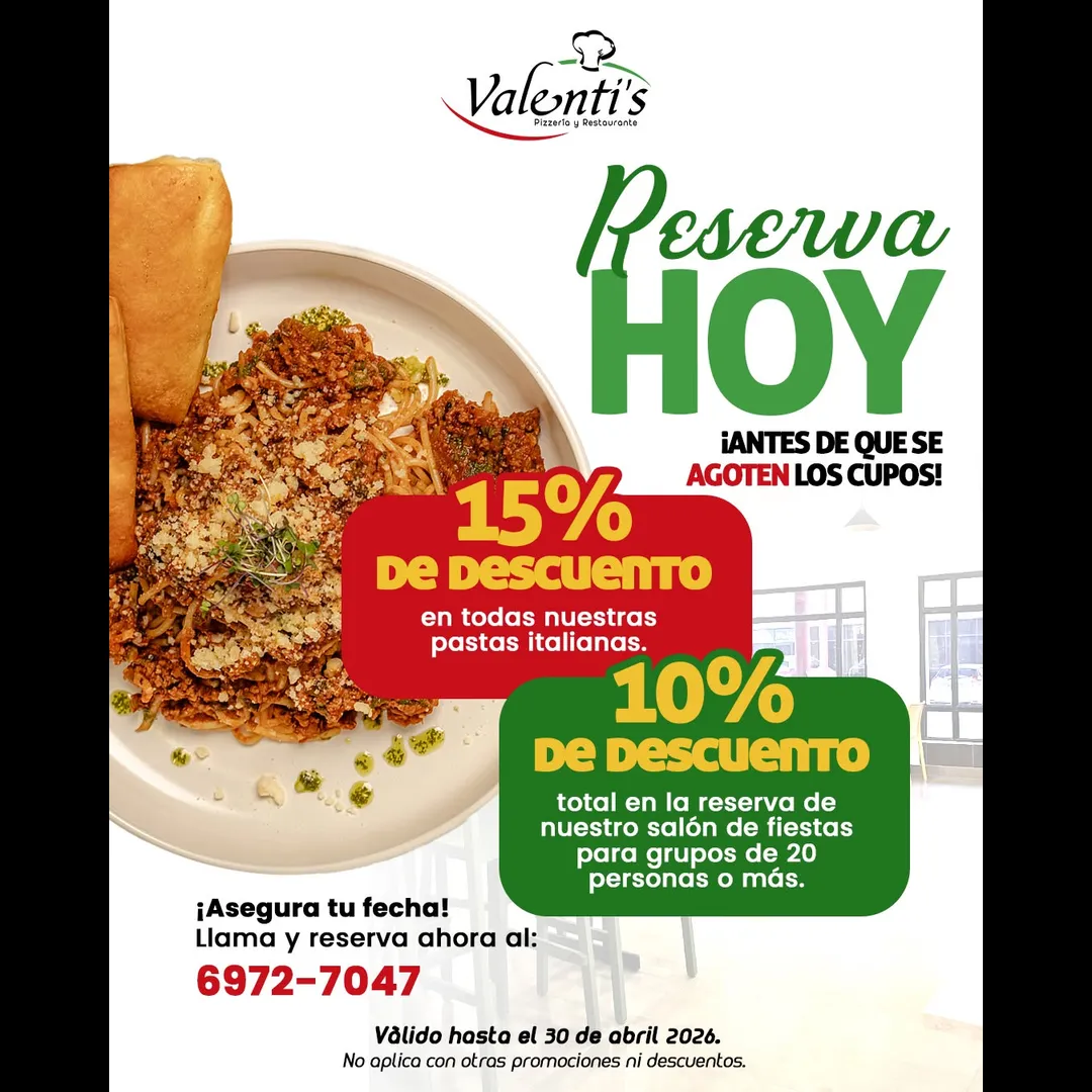 🍝 15% de DESCUENTO en todas nuestras pastas italianas durante todo el mes. 🎊 10% de DESCUENTO total en la reserva de nuestro salón de eventos (para grupos de 20 personas o más).