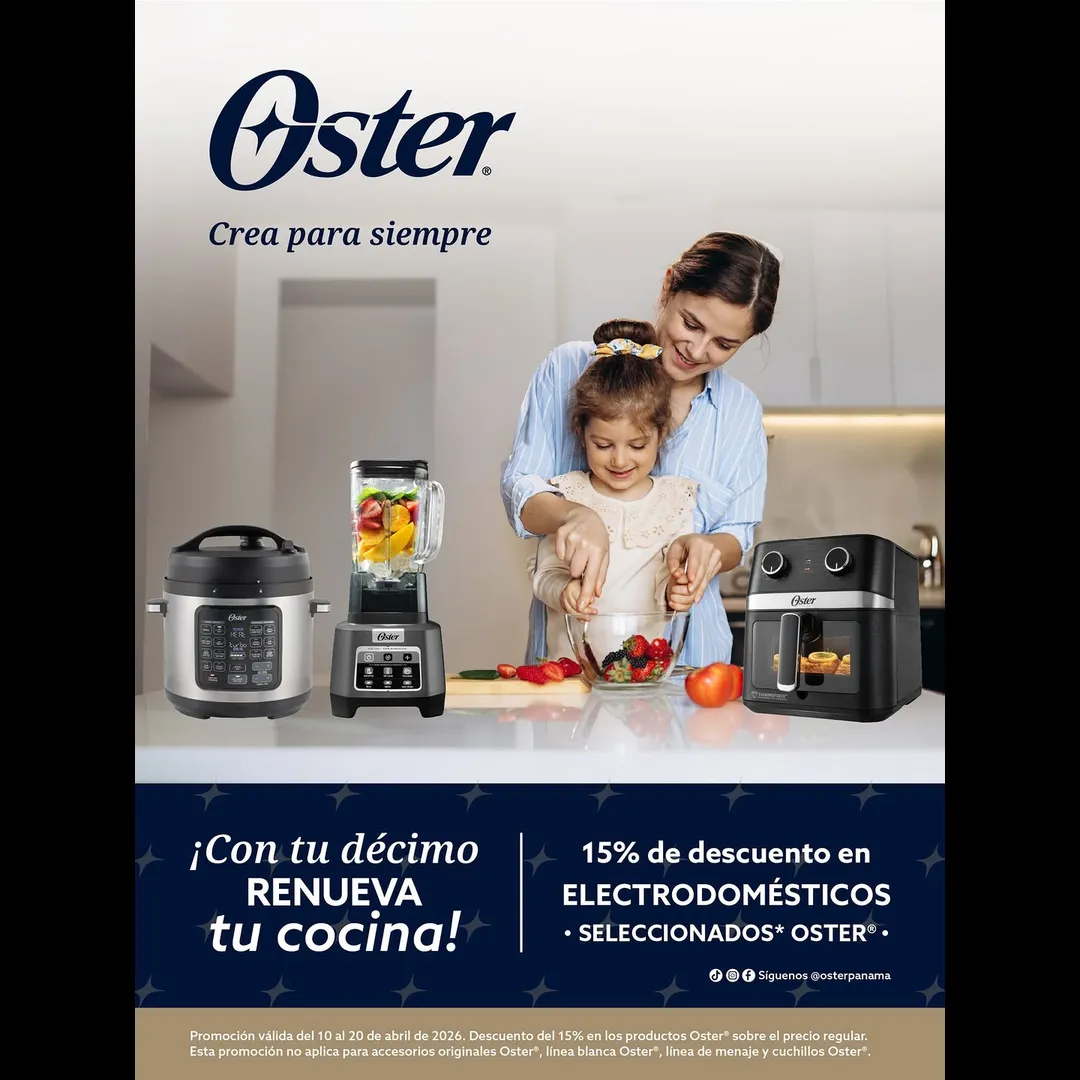 Promoción válida del 10 al 20 de abril de 2026. Descuento del 15% en productos Oster®️ sobre el precio regular. Esta promoción no aplica para accesorios originales Oster®️, línea blanca Oster®️, línea de menaje y cuchillos Oster®️.