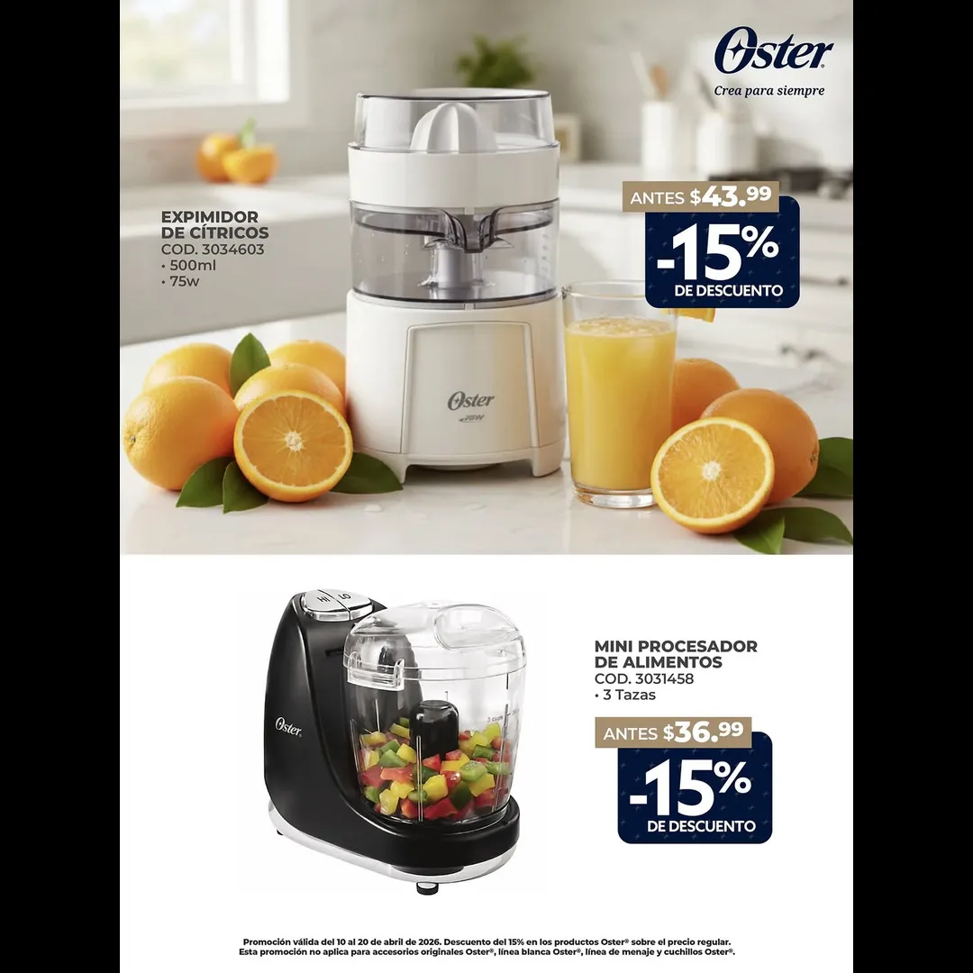 Promoción válida del 10 al 20 de abril de 2026. Descuento del 15% en productos Oster®️ sobre el precio regular. Esta promoción no aplica para accesorios originales Oster®️, línea blanca Oster®️, línea de menaje y cuchillos Oster®️.
