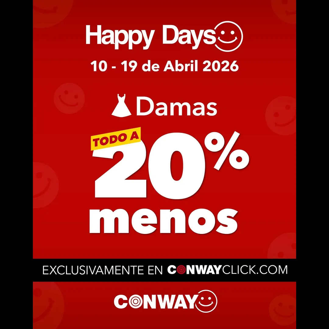 Ofertas válidas del 10 al 19 de abril 2026, 20% en muebles no incluye colchones ni boxes. 20% menos en dama y caballero es exclusivo en ConwayClick.com