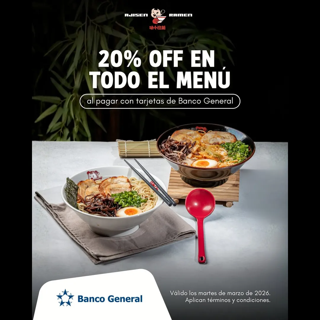 Disfruta 20% OFF en todo el menú al pagar con tus tarjetas Visa, Mastercard, corporativas, empresariales o Clave de Banco General 💳