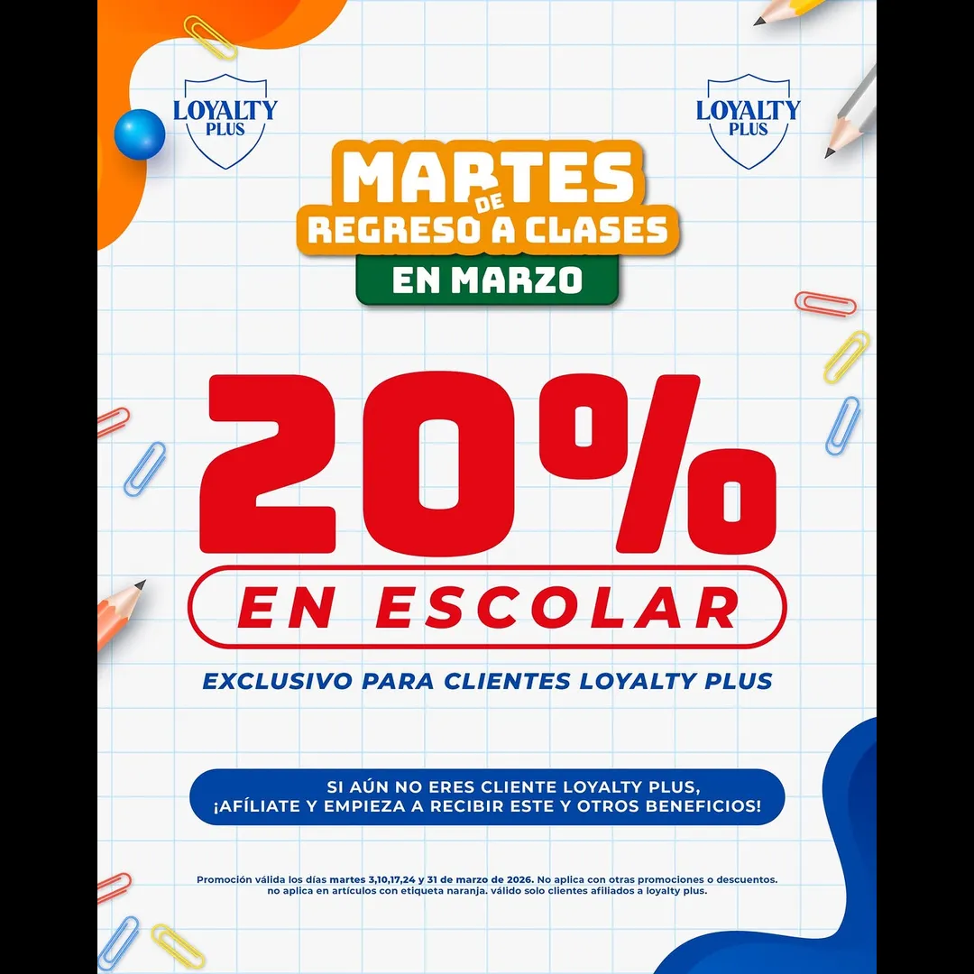 Aprovecha 20% en escolar todo marzo, exclusivo para clientes Loyalty Plus. 💙
