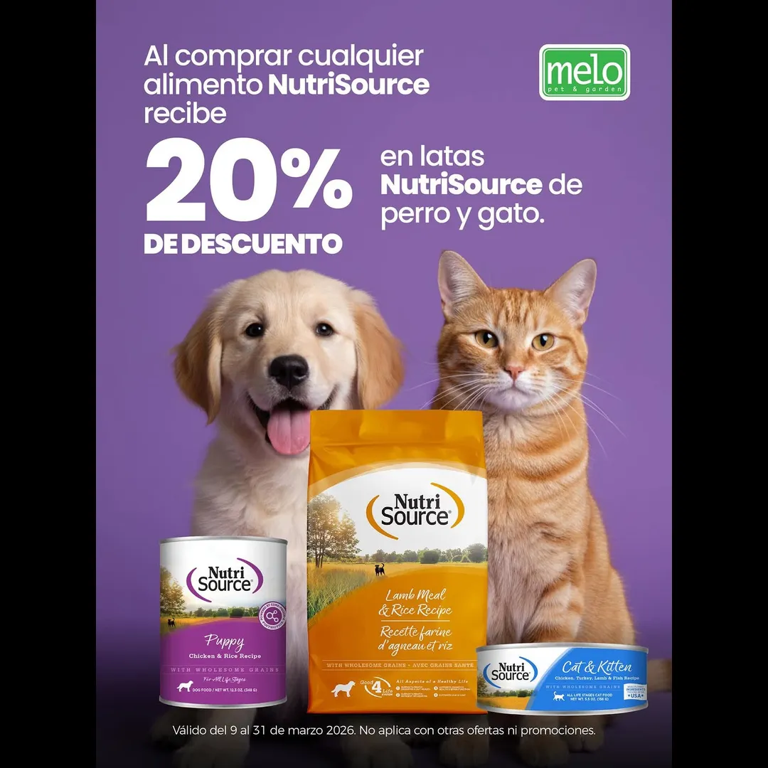 En marzo, al comprar cualquier alimento NutriSource recibe 20% de descuento en latas NutriSource de perro y gato.💜🐶🐱