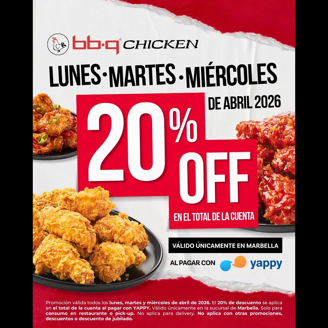 Promoción válida todos los lunes, martes y miércoles de abril de 2026. El 20% de descuento se aplica en el total de la cuenta al pagar con YAPPY. Válido únicamente en la sucursal de Marbella. Solo para consumo en restaurante o pick-up. No aplica para delivery. No aplica con otras promociones, descuentos o descuento de jubilado.