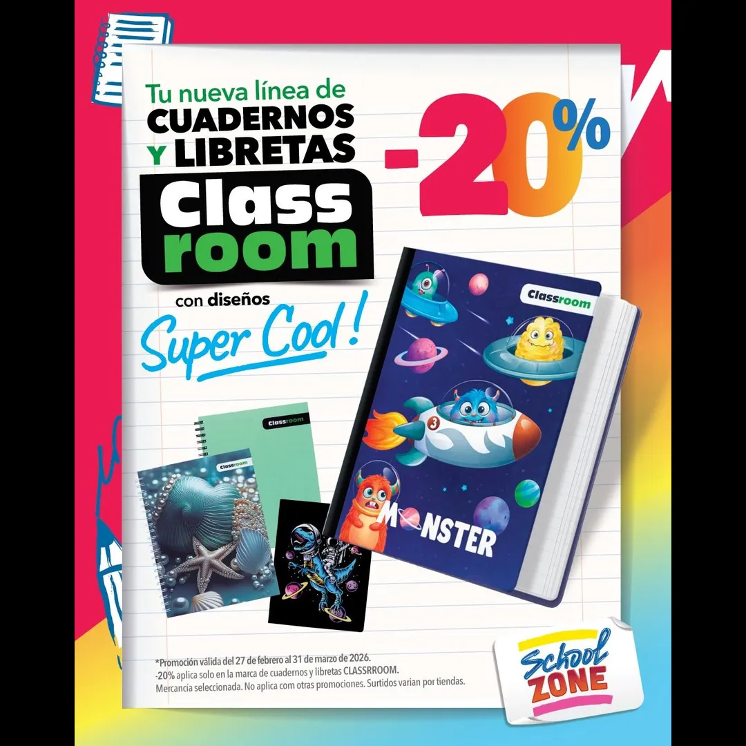 -20% aplica solo en la marca de cuadernos y libretas CLASSRROOM. Mercancía seleccionada. No aplica con otras promociones. Surtidos varian por tiendas.