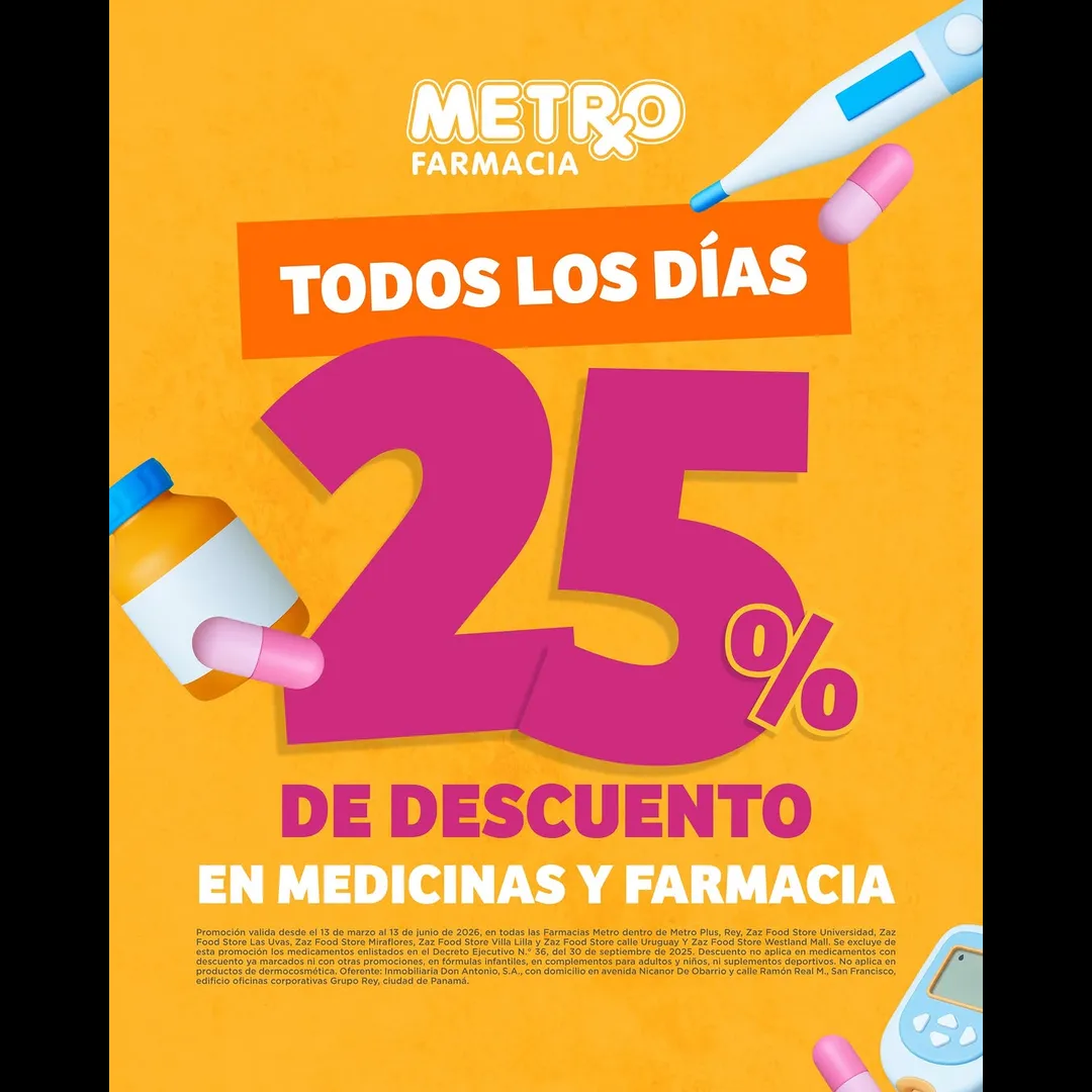 En Metro Farmacia disfruta 25% de descuento todos los días en medicinas y productos de farmacia.