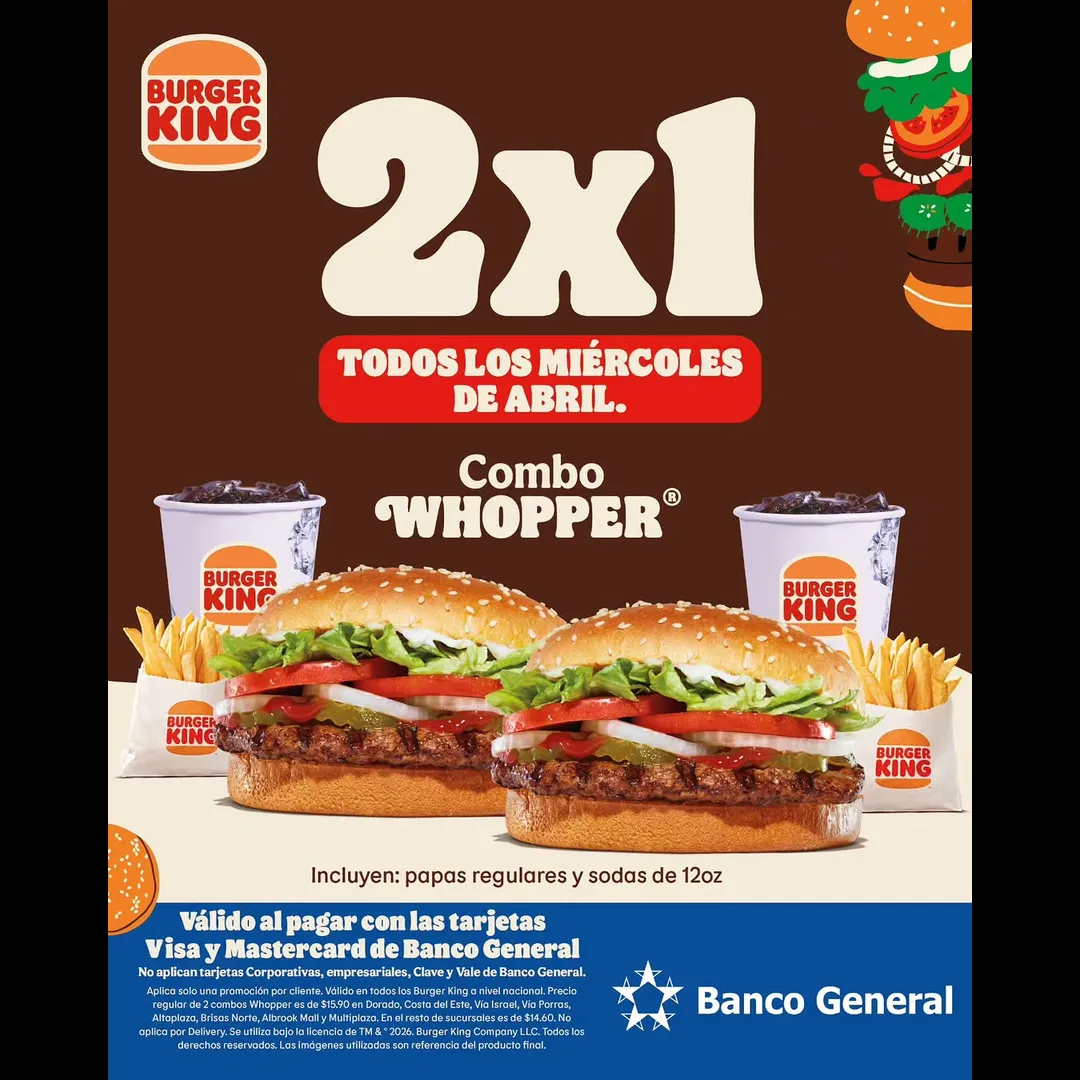 Aplica solo una promoción por cliente. Válido en todos los Burger King a nivel nacional. Precio regular de 2 combos Whopper es de $15.90 en Dorado, Costa del Este, Vía Israel, Vía Porras, Altaplaza, Brisas Norte, Albrook Mall y Multiplaza. En el resto de sucursales es de $14.60. No aplica por Delivery. Se utiliza bajo la licencia de TM & © 2026. Burger King Company LLC. Todos los derechos reservados. Las imágenes utilizadas son referencia del producto final.