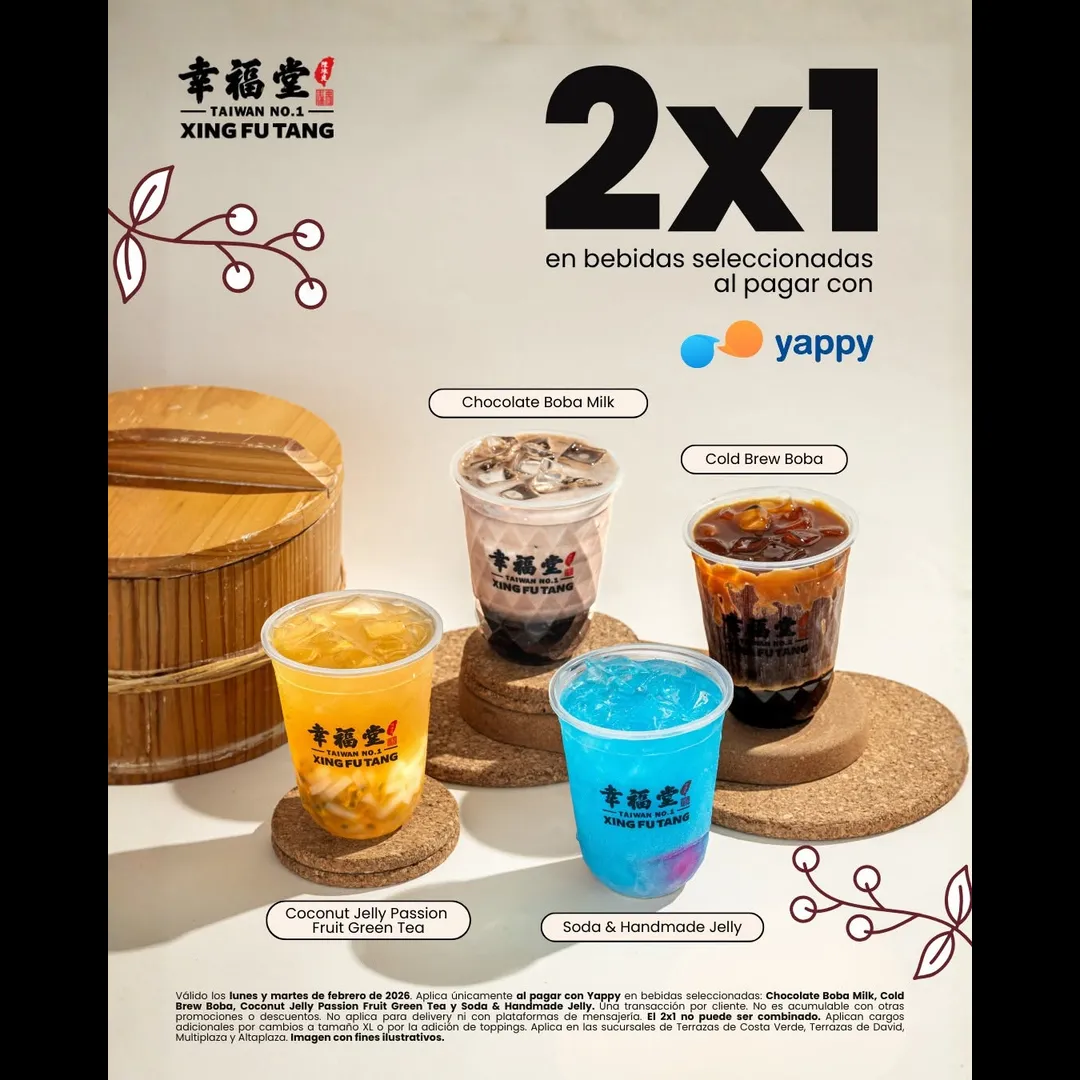 Válido los lunes y martes de febrero de 2026. Aplica únicamente al pagar con Yappy en bebidas seleccionadas: Chocolate Boba Milk, Cold Brew Boba, Coconut Jelly Passion Fruit Green Tea y Soda & Handmade Jelly. Una transacción por cliente. No es acumulable con otras promociones o descuentos. No aplica para delivery ni con plataformas de mensajería. El 2×1 no puede ser combinado. Aplican cargos adicionales por cambios a tamaño XL o por la adición de toppings. Aplica en las sucursales de Terrazas de Costa Verde, Terrazas de David, Multiplaza y Altaplaza. Imagen con fines ilustrativos.