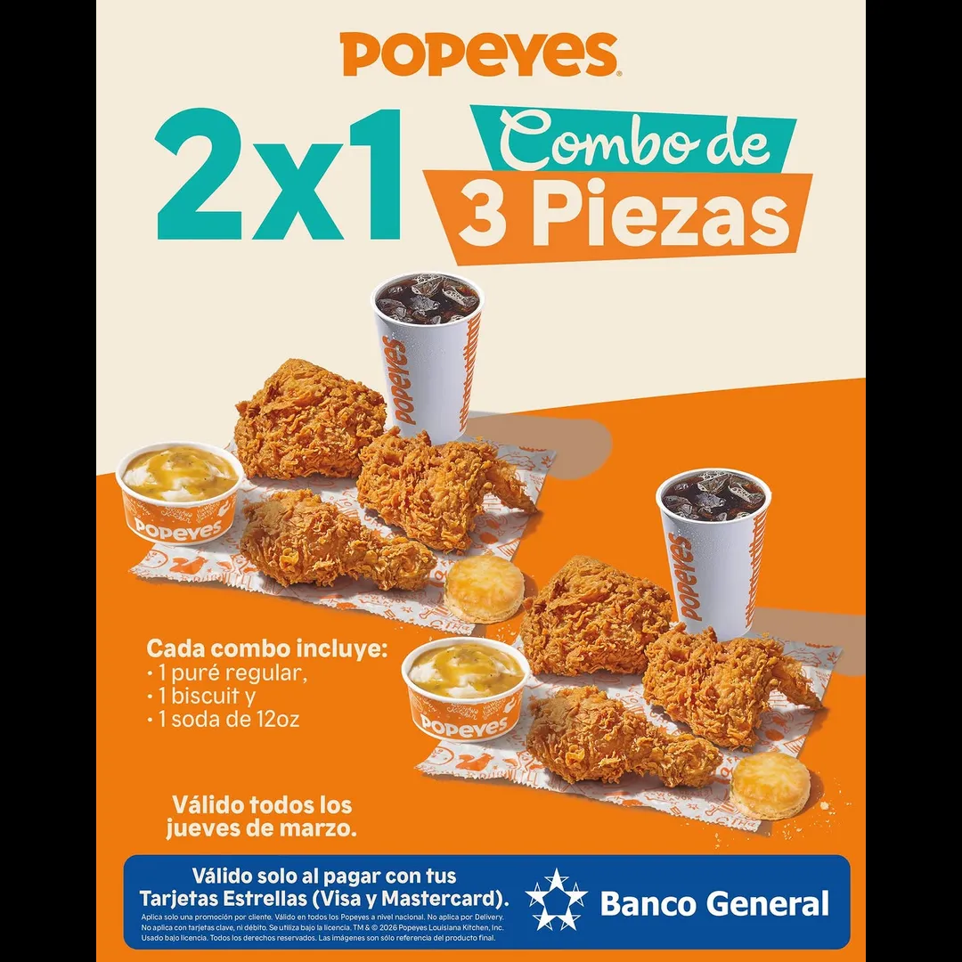 Aplica solo una promoción por cliente. Válido en todos los Popeyes a nivel nacional. No aplica por Delivery. No aplica con tarjetas clave, ni débito. Se utiliza bajo la licencia. TM & © 2026 Popeyes Louisiana Kitchen, Inc. Usado bajo licencia. Todos los derechos reservados. Las imágenes son sólo referencia del producto final.