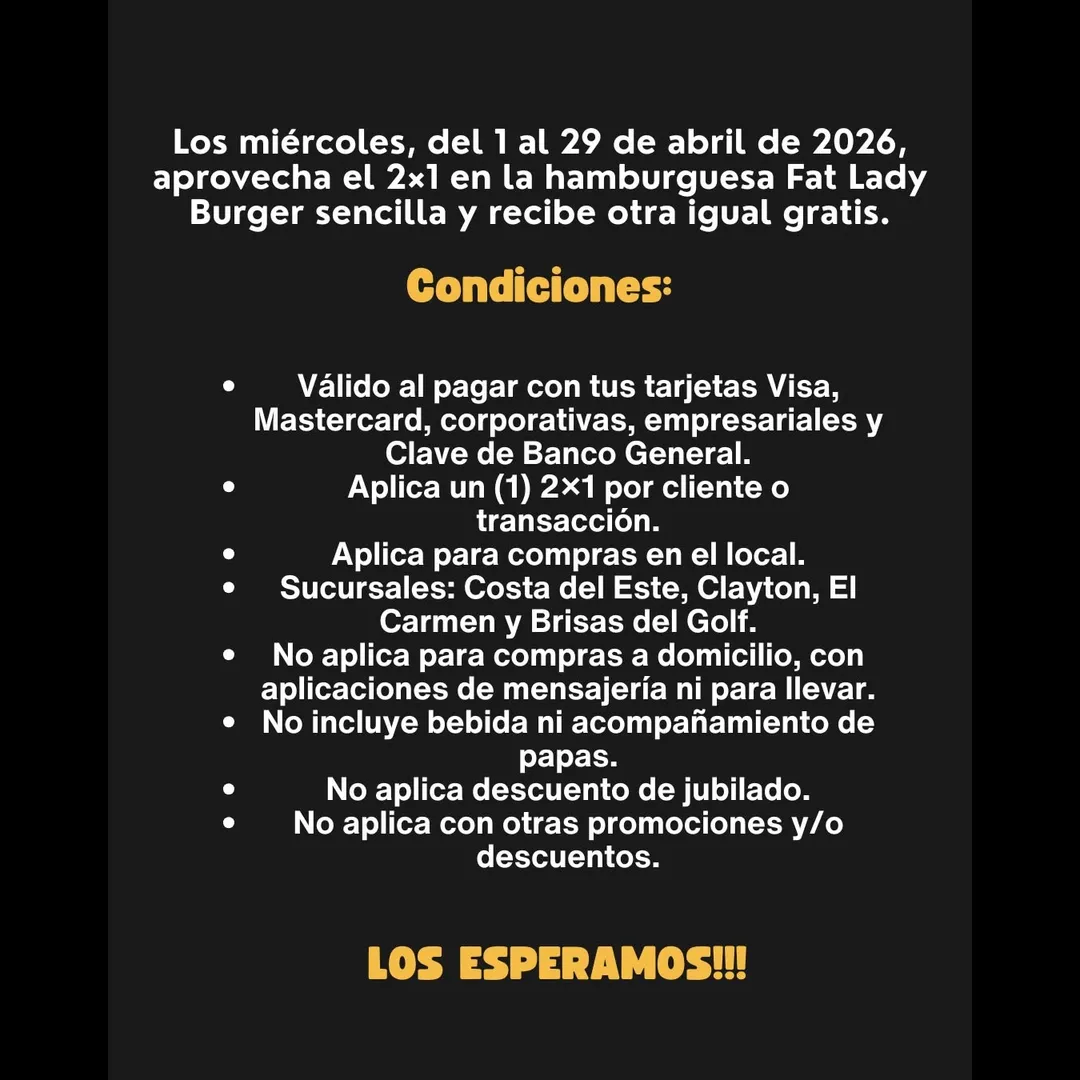 🚨2×1 LOS MIÉRCOLES DE ABRIL🍔 compra una Fat Lady Burger sencilla y recibe otra gratis con tus tarjetas de @bancogeneral 🙌 Te esperamos!!🤤