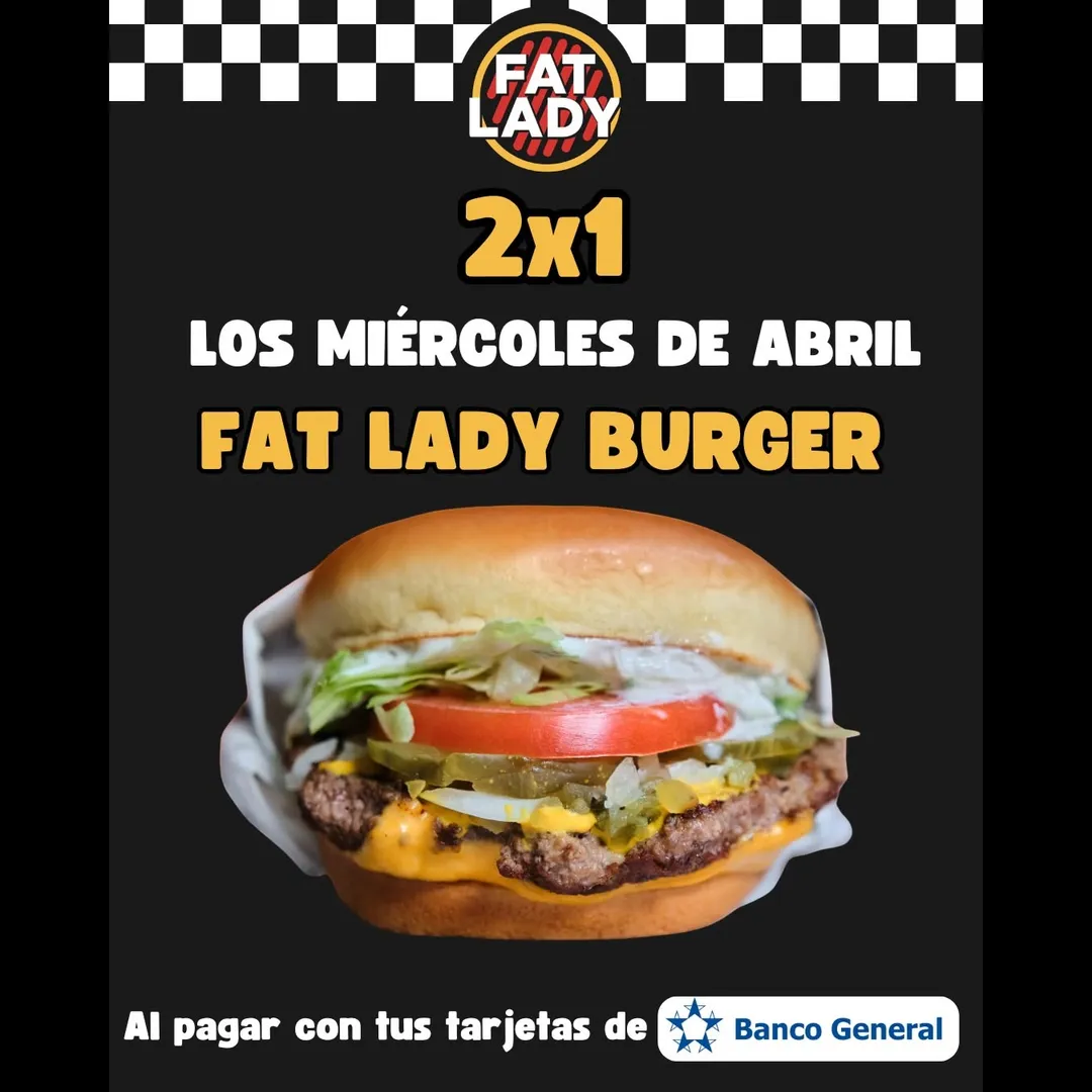 🚨2×1 LOS MIÉRCOLES DE ABRIL🍔 compra una Fat Lady Burger sencilla y recibe otra gratis con tus tarjetas de @bancogeneral 🙌 Te esperamos!!🤤