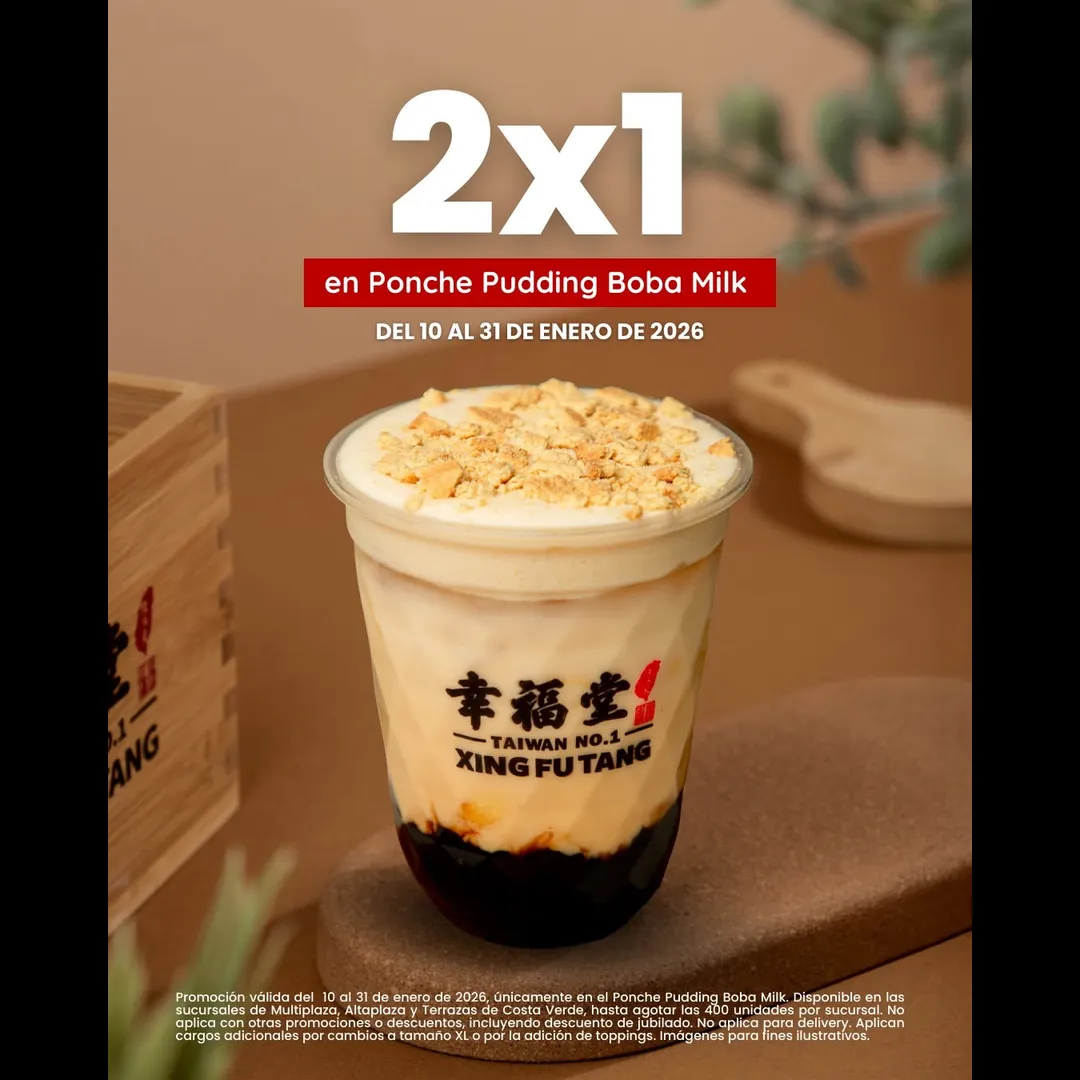 Promoción válida del 10 al 31 de enero de 2026, únicamente en el Ponche Pudding Boba Milk. Disponible en las sucursales de Multiplaza, Altaplaza y Terrazas de Costa Verde, hasta agotar las 400 unidades por sucursal. No aplica con otras promociones o descuentos, incluyendo descuento de jubilado. No aplica para delivery. Aplican cargos adicionales por cambios a tamaño XL o por la adición de toppings. Imágenes para fines ilustrativos.