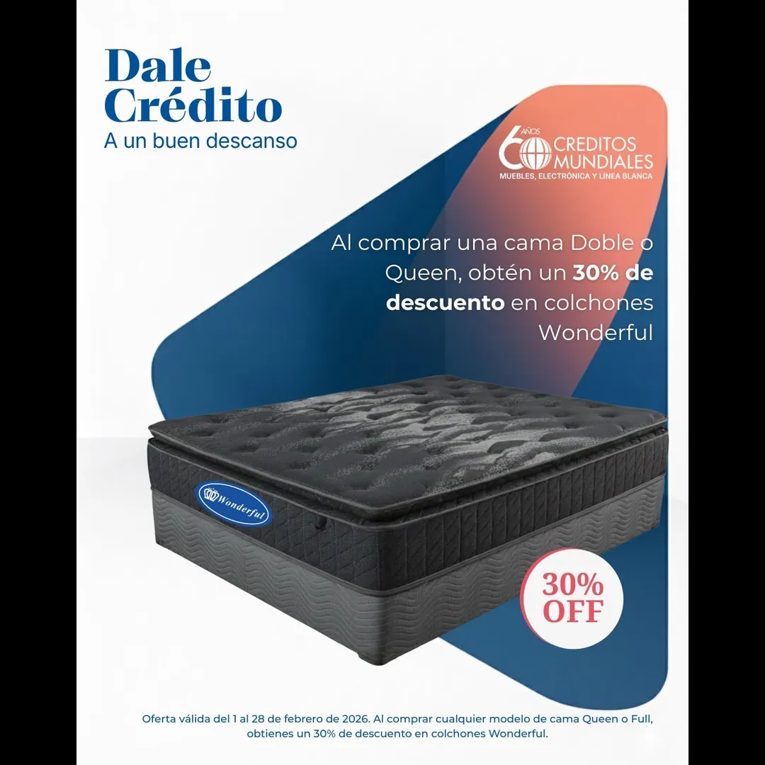 👉 Al comprar una cama Doble o Queen, obtén 30% OFF en colchones Wonderful.