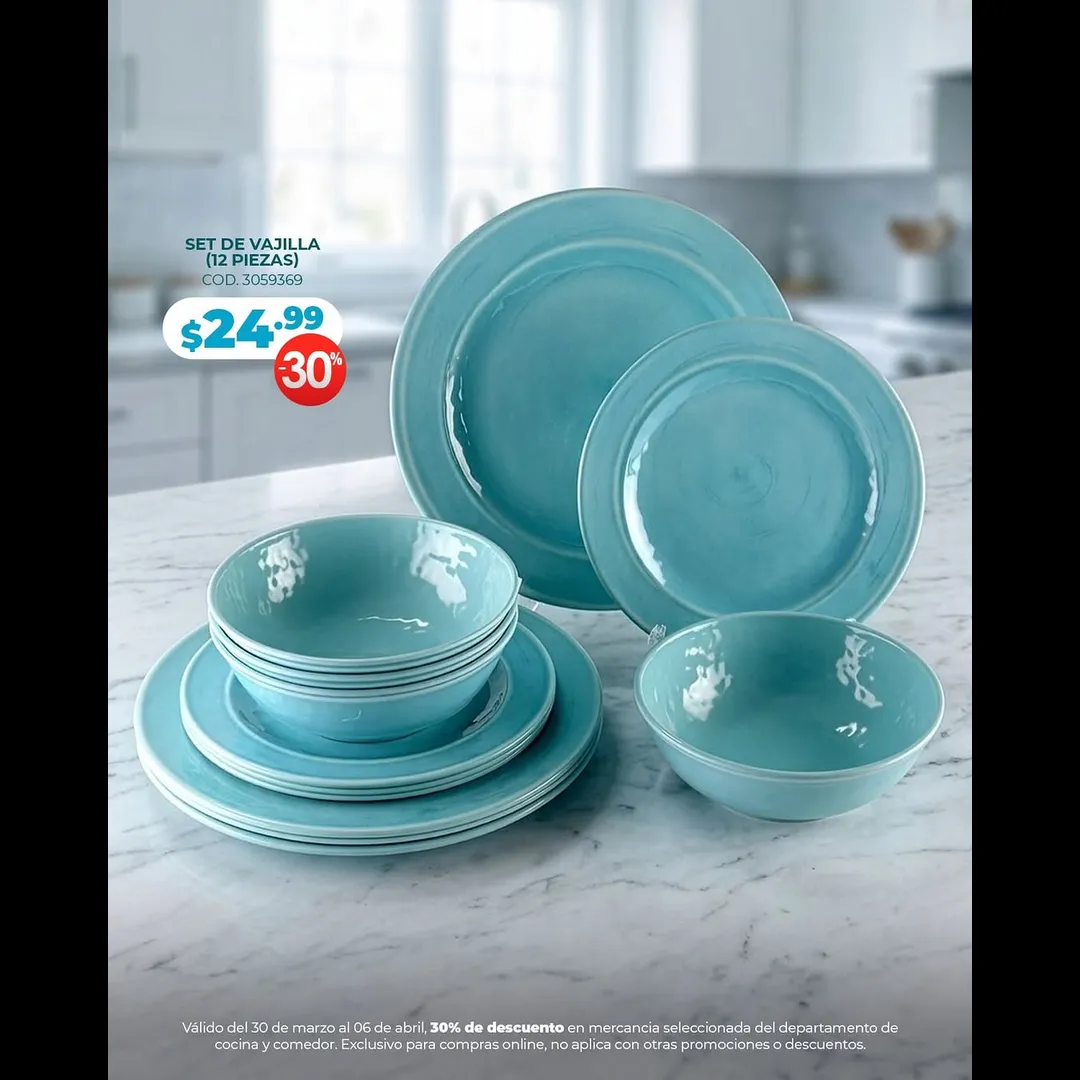 Promoción válida del 30 de marzo al 06 de abril. Aplica en mercancía seleccionada de cocina y comedor. Exclusivo en compras online. No aplica con otras promociones o descuentos.