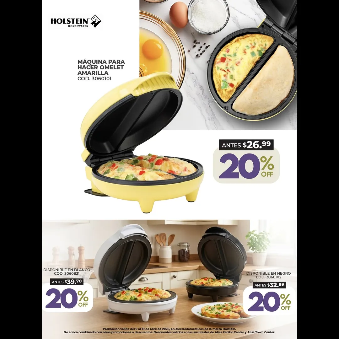 Promoción válida del 9 al 19 de abril de 2026 en electrodomésticos seleccionados de la marca Holstein. No aplica con otras promociones o descuentos.