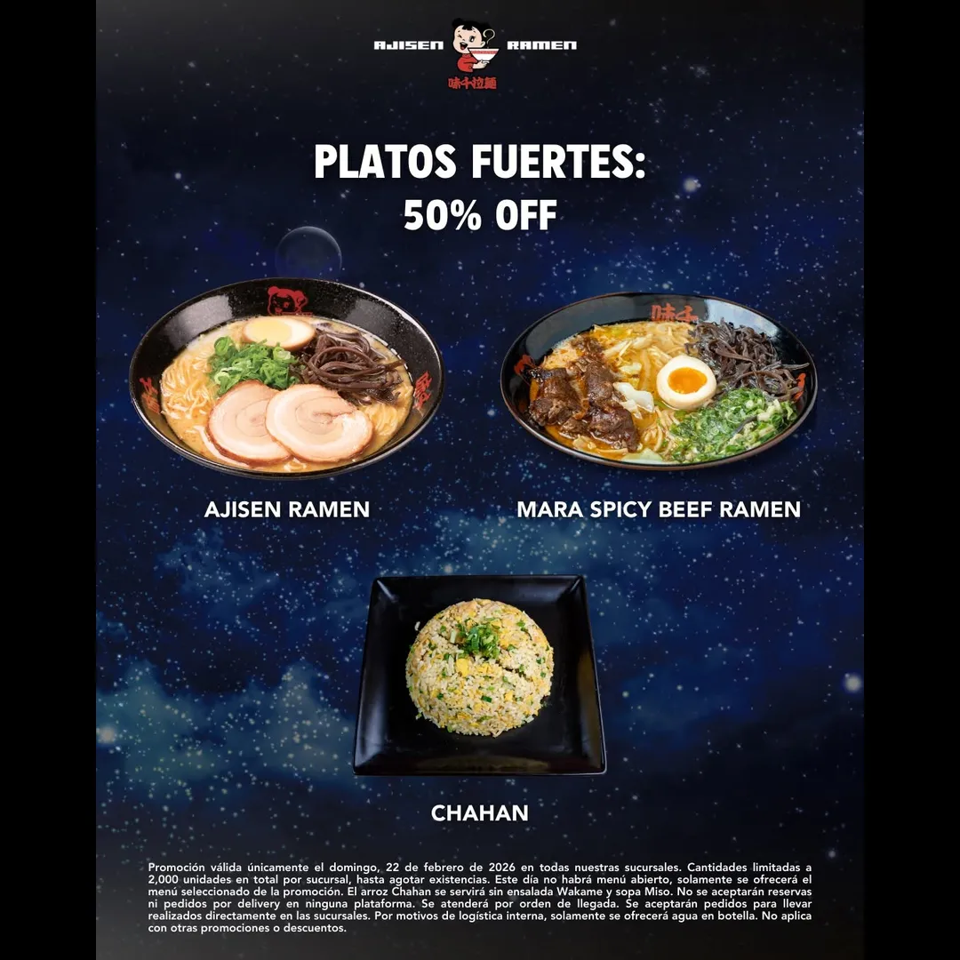 Promoción válida únicamente el domingo 22 de febrero de 2026 en todas las sucursales Ajisen Ramen. Aplica 50% OFF en los platos seleccionados del menú de la promoción. Cantidades limitadas a 2,000 unidades por sucursal, hasta agotar existencias. Este día no habrá menú abierto; solo se ofrecerá el menú seleccionado. El arroz Chahan se servirá sin ensalada Wakame ni sopa Miso. No se aceptarán reservas ni pedidos por delivery ni plataformas de mensajería. Atención por orden de llegada. Se aceptan pedidos para llevar realizados directamente en las sucursales. Por motivos de logística interna, únicamente se ofrecerá agua en botella. No aplica con otras promociones o descuentos. Imagen con fines ilustrativos.