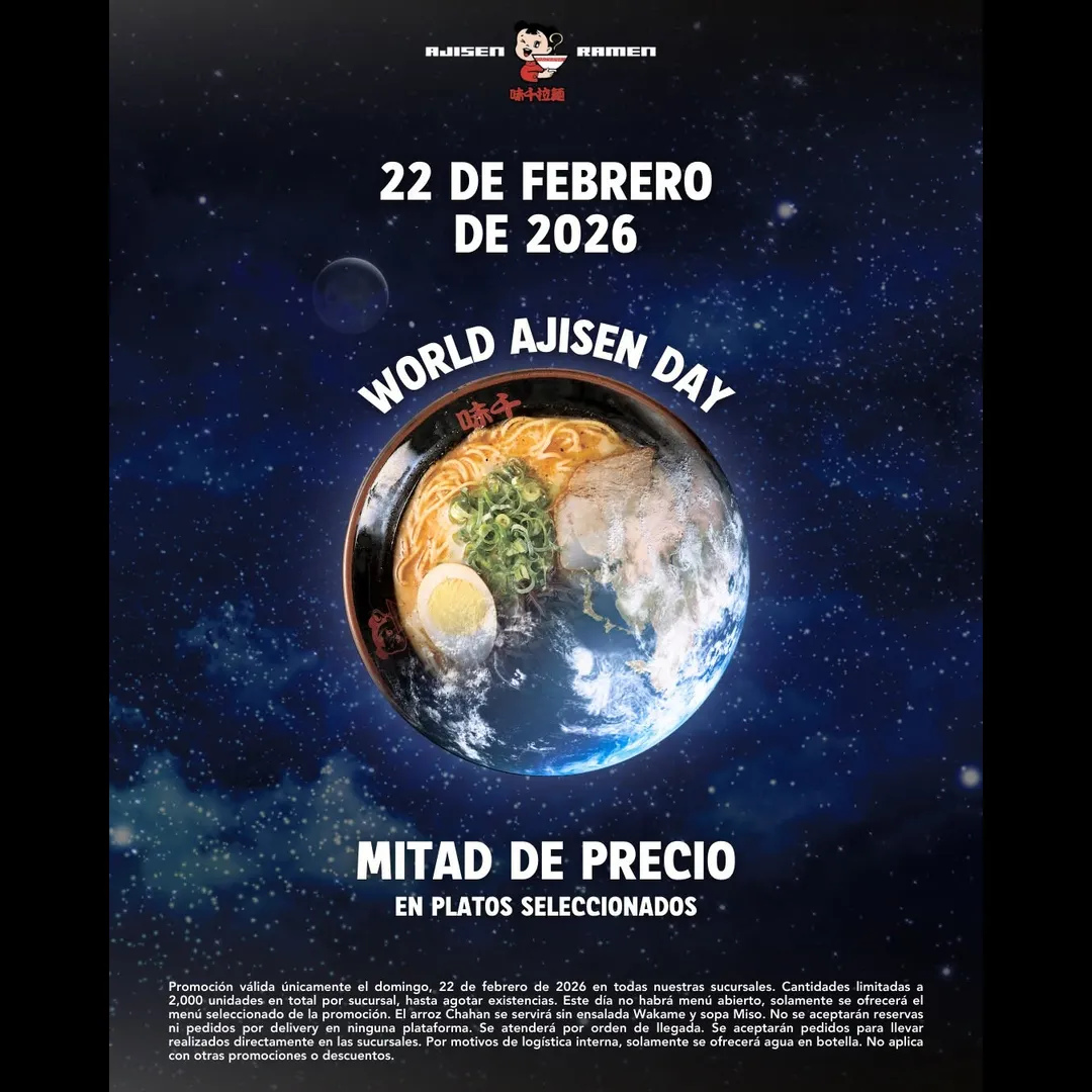 Este 22 de febrero celebramos el World Ajisen Day y lo hacemos con 50% DE DESCUENTO en nuestros platos más icónicos 🍜