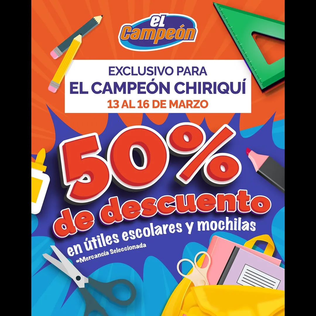 Del 13 al 16 de marzo de 2026. Exclusivo en El Campeón Chiriquí. No aplica con otros descuentos y/o promociones.