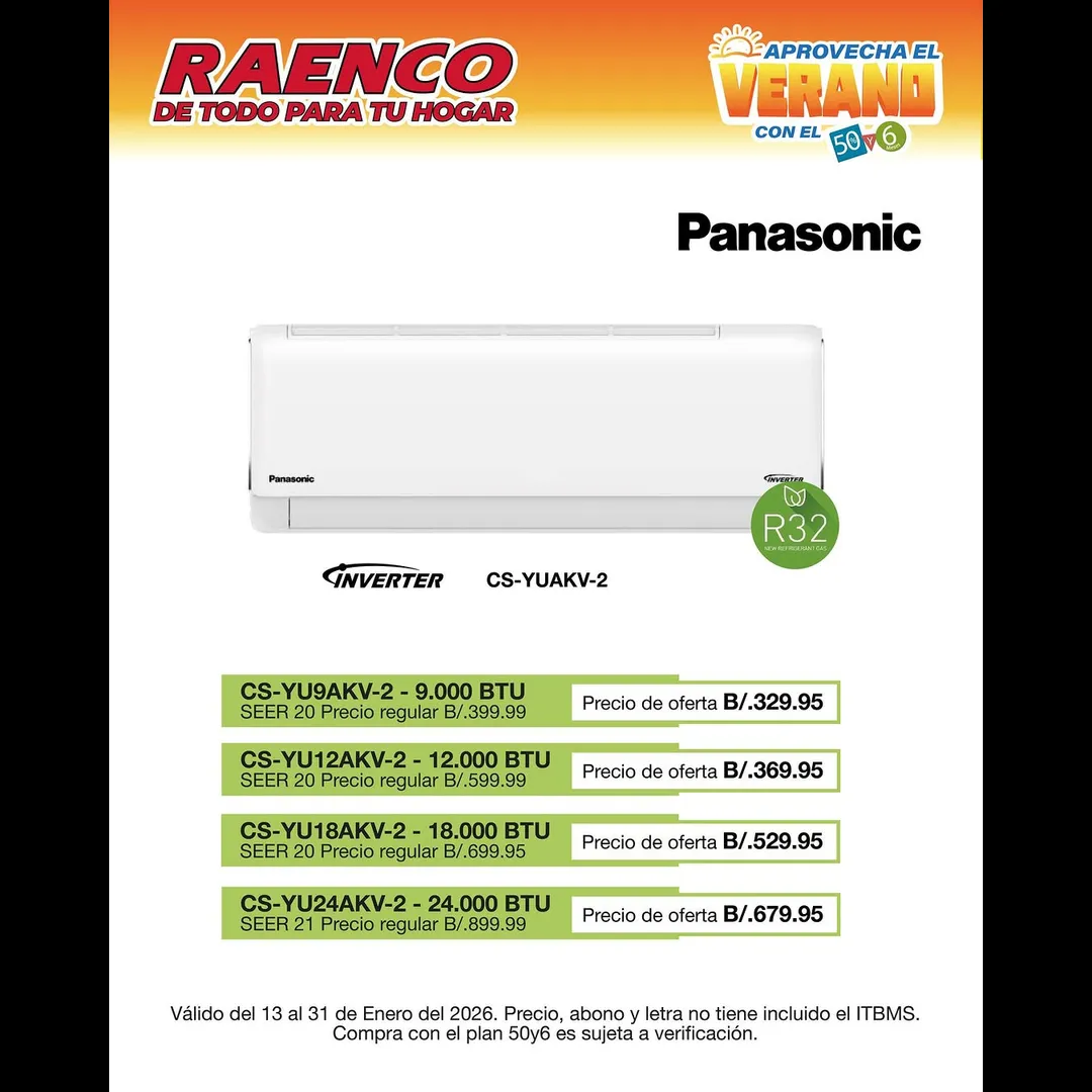 Eficiencia Inverter R32: Ahorra energía con modelos de alta eficiencia (SEER 20 y 21). Encuéntralos desde B/. 329.95. + 7%