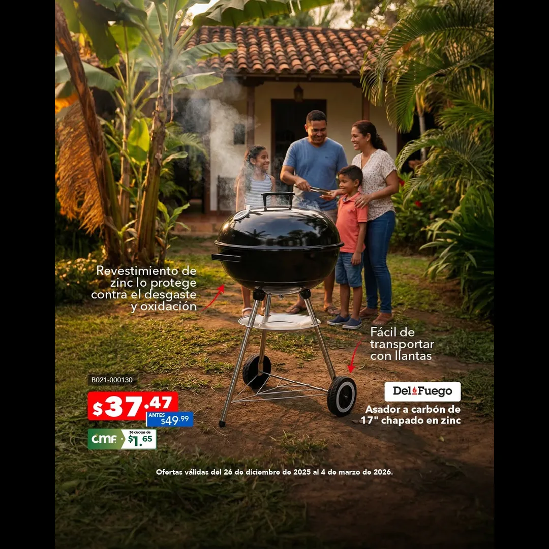 Y lo mejor: con CMF puedes llevarte tu asador sin abono inicial y pagarlo hasta en 36 cuotas mensuales, para que disfrutes hoy y pagues cómodo después 😉