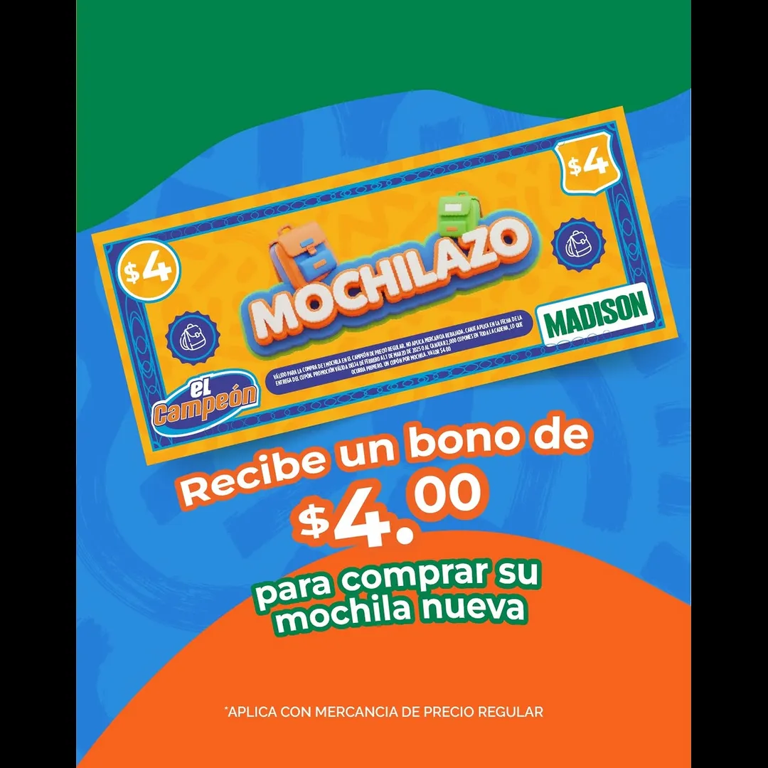 Con El Mochilazo puedes renovar su mochila y pagar menos. Trae la 🎒 vieja, y recibe un bono válido por $4 para comprar una nueva.