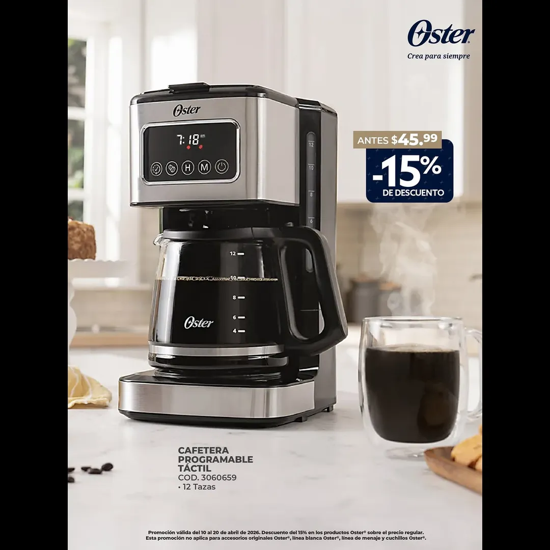 Promoción válida del 10 al 20 de abril de 2026. Descuento del 15% en productos Oster®️ sobre el precio regular. Esta promoción no aplica para accesorios originales Oster®️, línea blanca Oster®️, línea de menaje y cuchillos Oster®️.