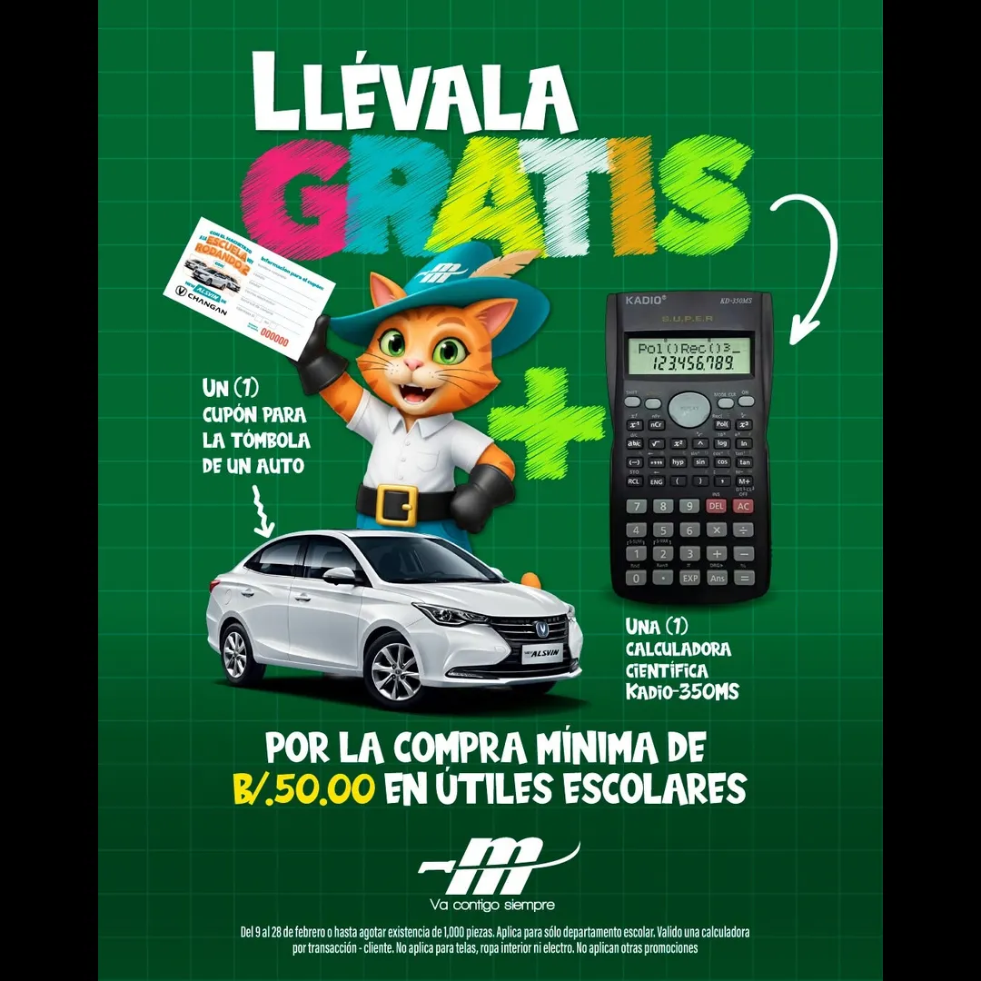 Por la compra mínima de B/.50.00 en útiles escolares, recibe una calculadora científica Kadio 350MS 🧮
