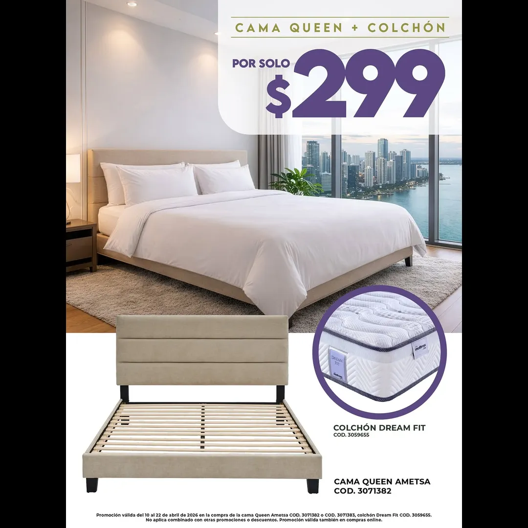 Promoción válida del 10 al 22 de abril de 2026 en la compra de la cama Queen Ametsa (COD. 3071382 o 3071383) + colchón Dream Fit (COD. 3059655). No aplica con otras promociones o descuentos. Válido también en compras online.