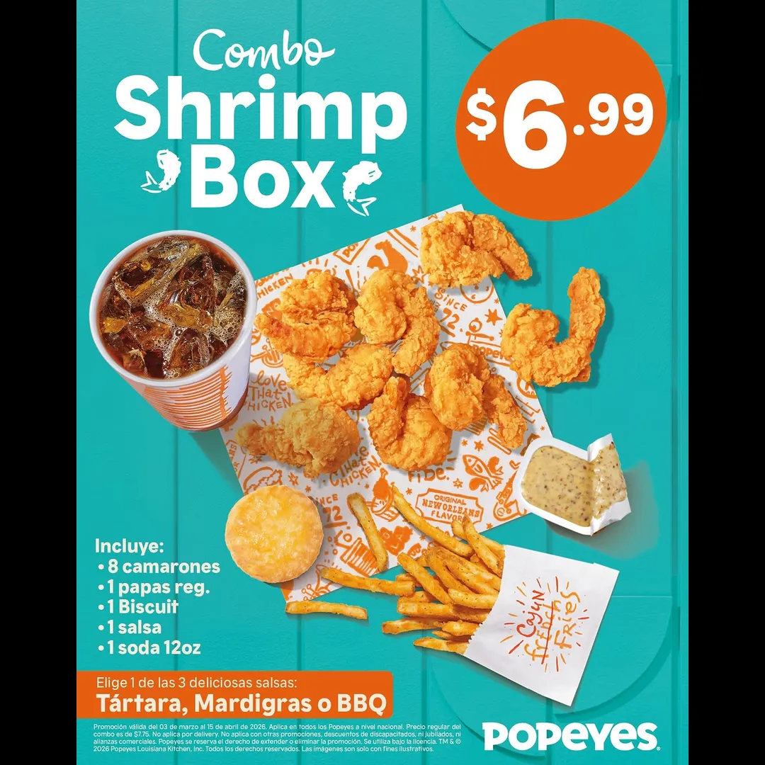 Promoción válida del 03 de marzo al 15 de abril de 2026. Aplica en todos los Popeyes a nivel nacional. Precio regular del combo es de $7.75. No aplica con otras promociones, descuentos de discapacitados, ni jubilados, ni alianzas comerciales. Popeyes se reserva el derecho de extender o eliminar la promoción. Se utiliza bajo la licencia. TM & © 2026 Popeyes Louisiana Kitchen, Inc. Todos los derechos reservados. Las imágenes son solo con fines ilustrativos.