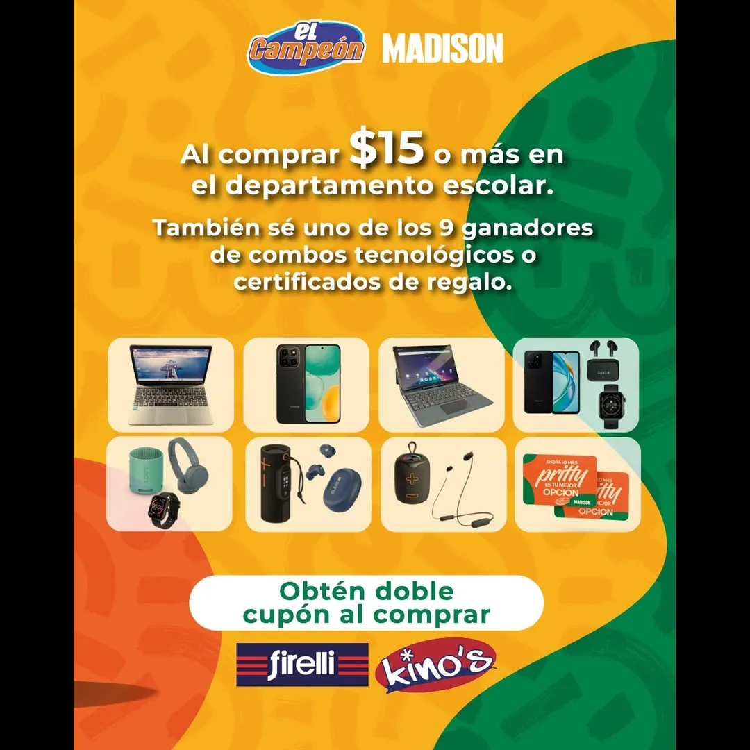 Al comprar $15 o más en el departamento escolar, participas para ganar 1 auto GAC EMZOOM. Además, puedes ser uno de los 9 ganadores de combos tecnológicos o certificados de regalo. Obtén doble cupón al comprar las marcas FIRELLI o KINO’S.