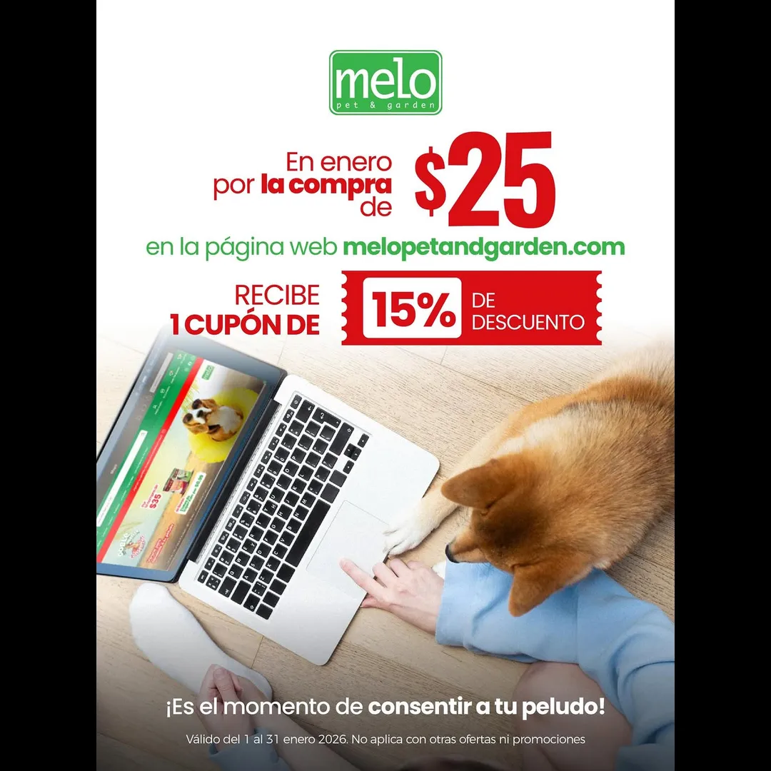 En enero al comprar $25 en melopetandgarden.com recibe 1 cupón de 15% de descuento. 💻💚🐶