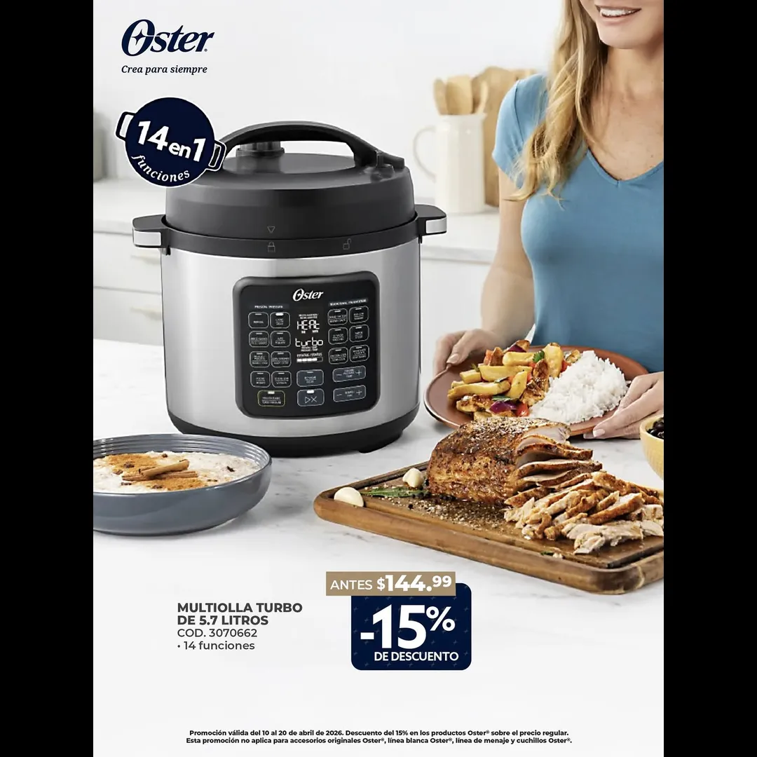Promoción válida del 10 al 20 de abril de 2026. Descuento del 15% en productos Oster®️ sobre el precio regular. Esta promoción no aplica para accesorios originales Oster®️, línea blanca Oster®️, línea de menaje y cuchillos Oster®️.