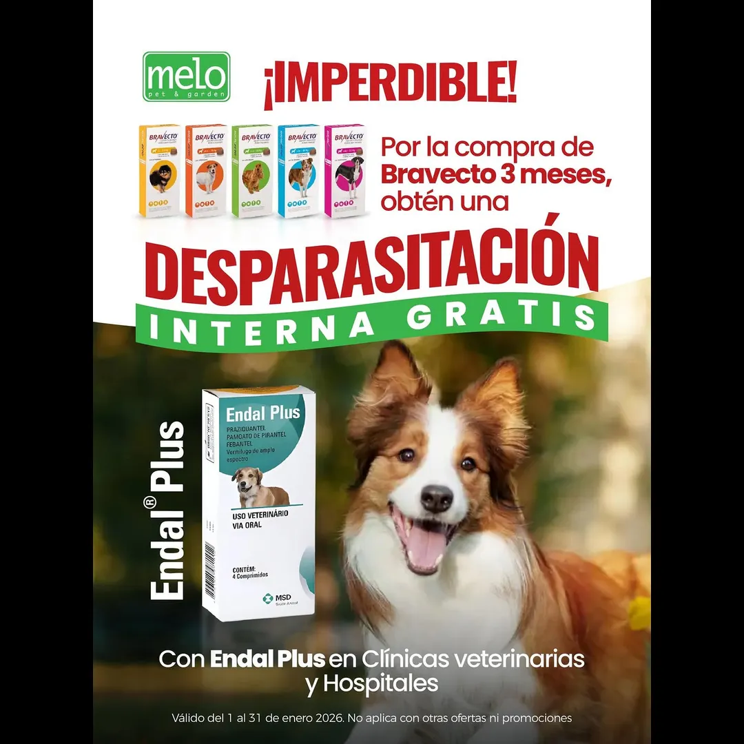 Por la compra de Bravecto 3 meses, obtén 1 desparasitación interna gratis con Endal Plus en las Clínicas veterinarias y Hospitales Melo Pet & Garden.🫶🏻💚🐶🐱