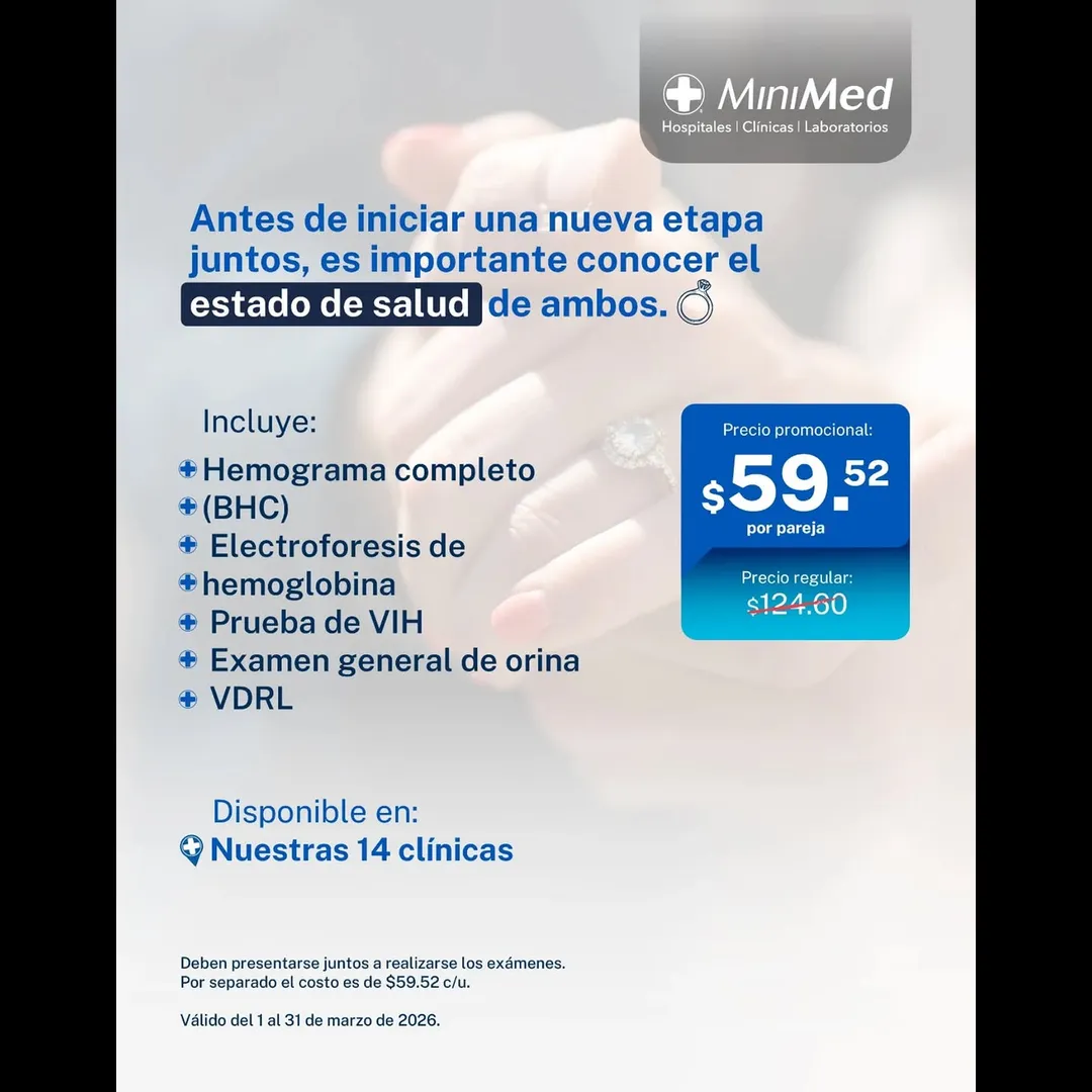 💍 Antes de dar el “sí, acepto”, es importante conocer el estado de salud de ambos. En MiniMed contamos con un paquete de exámenes prematrimoniales completo y accesible, para que comiencen esta nueva etapa con tranquilidad.