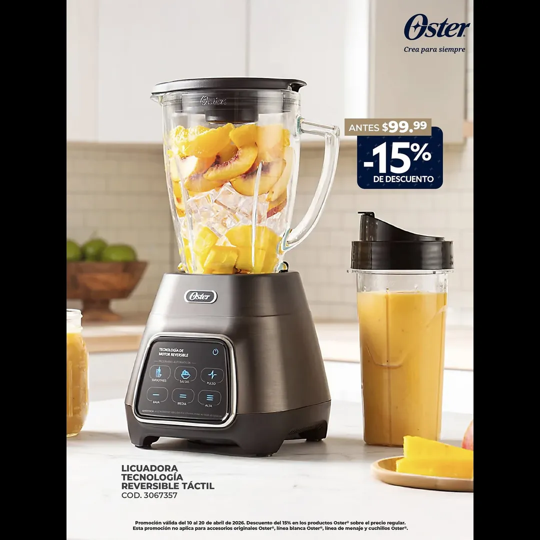 Promoción válida del 10 al 20 de abril de 2026. Descuento del 15% en productos Oster®️ sobre el precio regular. Esta promoción no aplica para accesorios originales Oster®️, línea blanca Oster®️, línea de menaje y cuchillos Oster®️.
