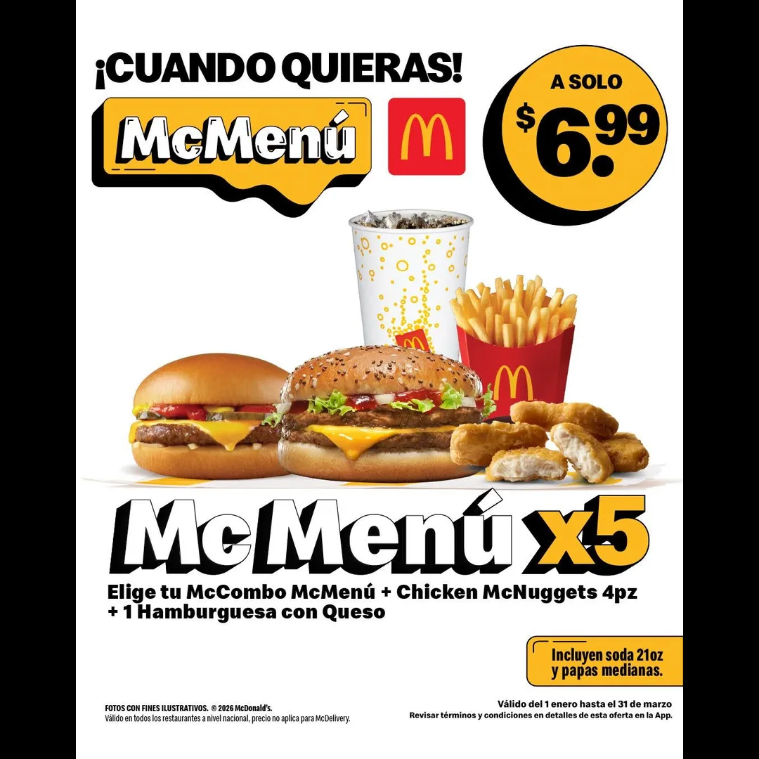 McMenú x5 llegó para salvarte con tu McCombo McMenú favorito + Chicken McNuggets 4 pz + una Hamburguesa con Queso por solo $6.99.