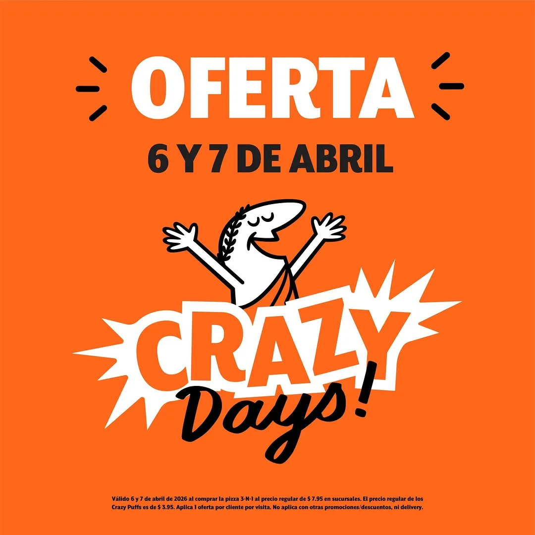 *Oferta válida solo este lunes 6 y martes 7 de abril 2026 durante todo el día en todas las sucursales. Al comprar una pizza familiar 3-N-1 al precio regular de $7.95, puedes llevar una orden de Crazy Puffs por tan solo $1 adicional en cualquiera de nuestras sucursales. El precio regular de la orden de Crazy Puffs es de $3.95 en sucursales. Aplica una oferta por cliente por visita. No aplica con otras promociones ni descuentos. No aplica en pedidos a domicilio/delivery.