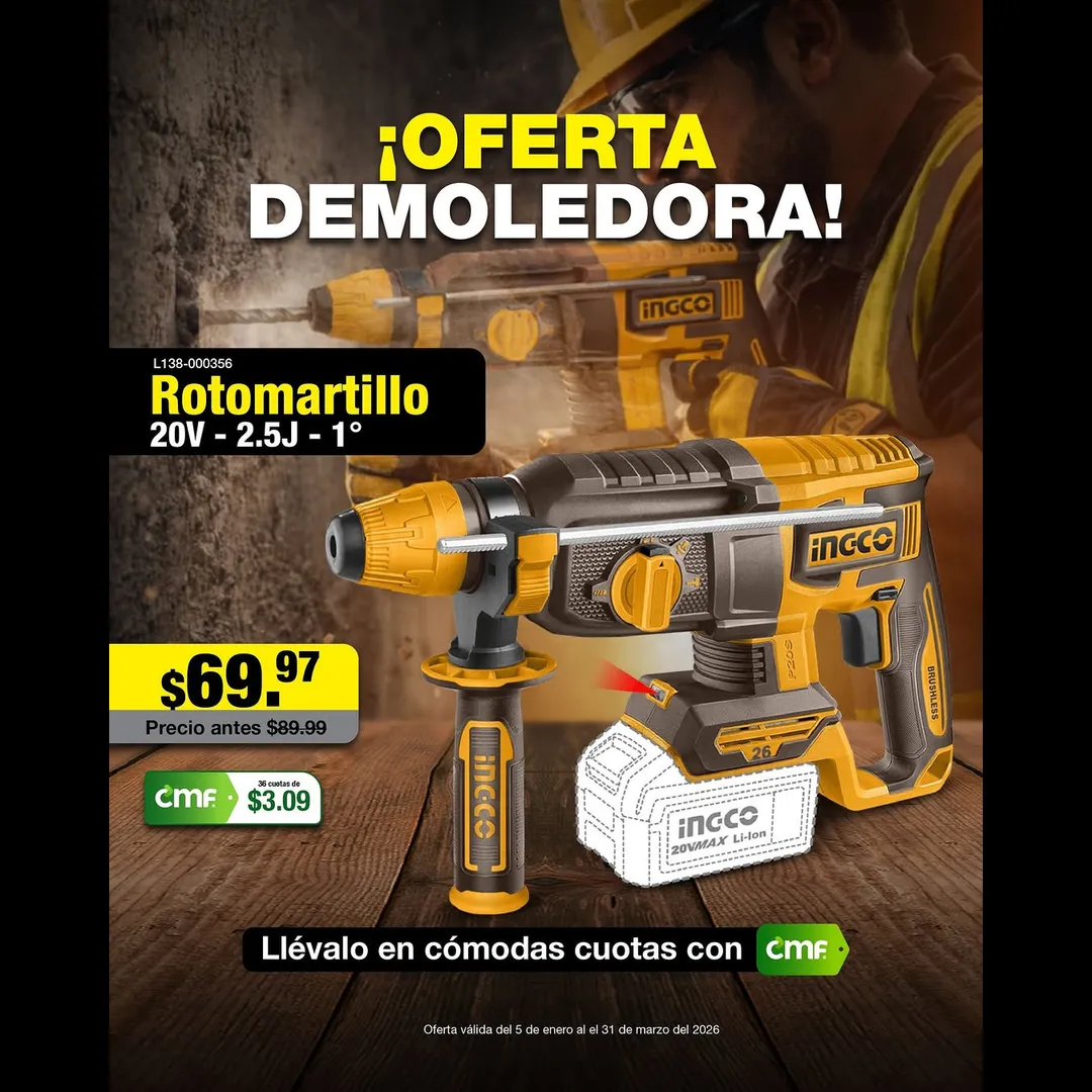 Llévate el rotomartillo INGCO 20V en oferta y págalo en cómodas cuotas con CMF.🤑 Más fuerza para tu trabajo, sin descuadrar el presupuesto.💯
