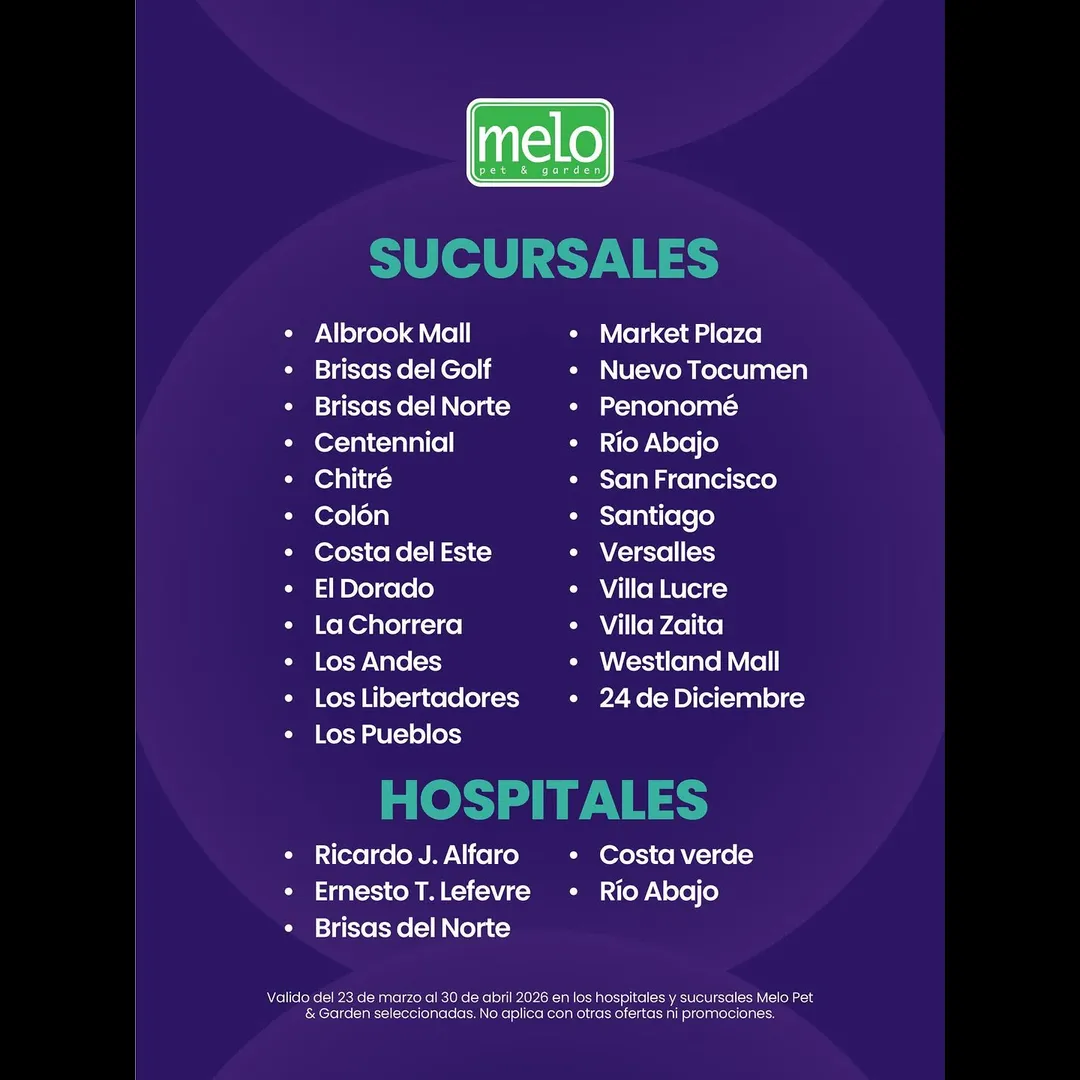 ▫️Válido del 23 de marzo al 30 de abril 2026 en las sucursales Melo Pet & Garden seleccionadas.