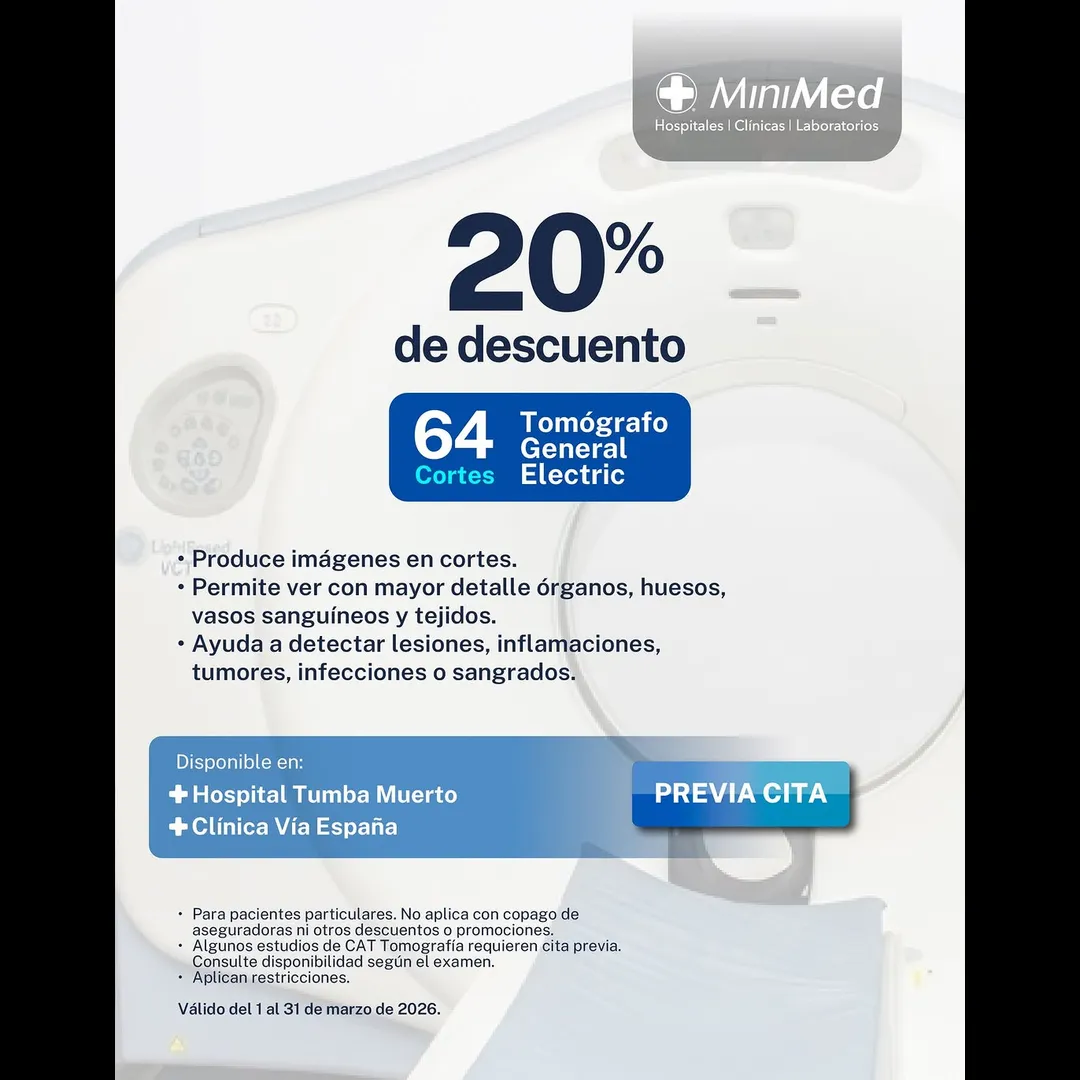 En MiniMed ponemos a su disposición Tomografía CAT con tecnología de 64 cortes, a 20% de descuento. ✨ Ideal para diagnósticos precisos y oportunos. 🏥 Disponible en: Hospital