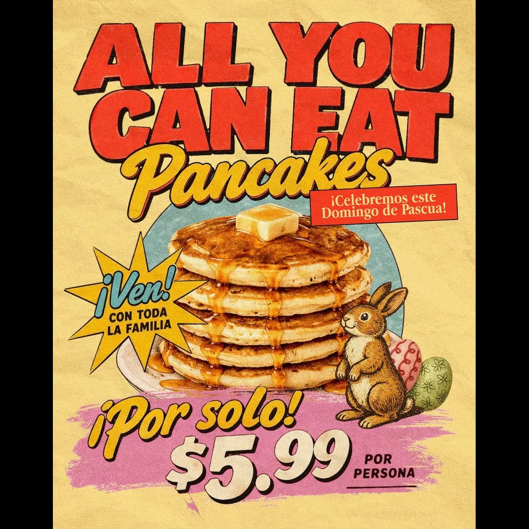 Por solo $5.99 por persona, hoy y mañana, durante todo el día, puedes comer todos los pancakes que quieras (y puedas! 😏)