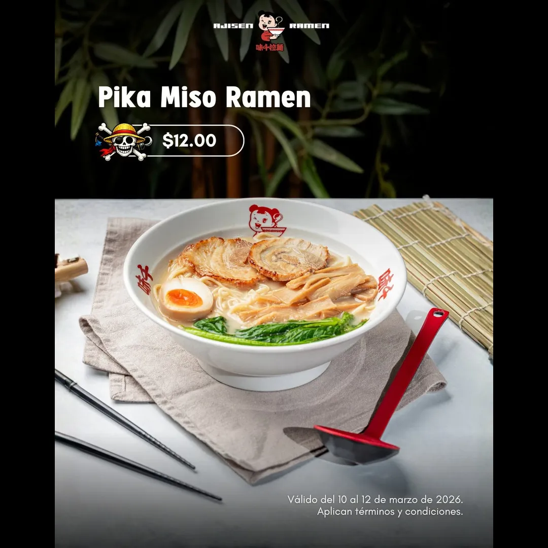 Promoción válida del 10 al 12 de marzo de 2026 en cualquiera de nuestras sucursales. Cantidades limitadas: 200 unidades por sucursal. No aplica con otras promociones o descuentos. No aplica para delivery ni a través de plataformas de mensajería. Precio no incluye ITBMS. Válido únicamente para pedidos para llevar realizados directamente en la sucursal o a través de nuestra página web ajisen.clau.io. Imagen con fines ilustrativos.