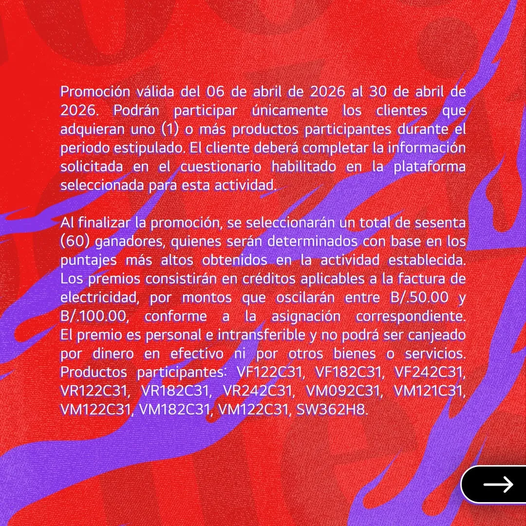 Promoción válida del 06 de abril de 2026 al 30 de abril de 2026. Podrán participar únicamente los clientes que adquieran uno (1) o más productos participantes durante el periodo estipulado. El cliente deberá completar la información solicitada en el cuestionario habilitado en la plataforma seleccionada para esta actividad.