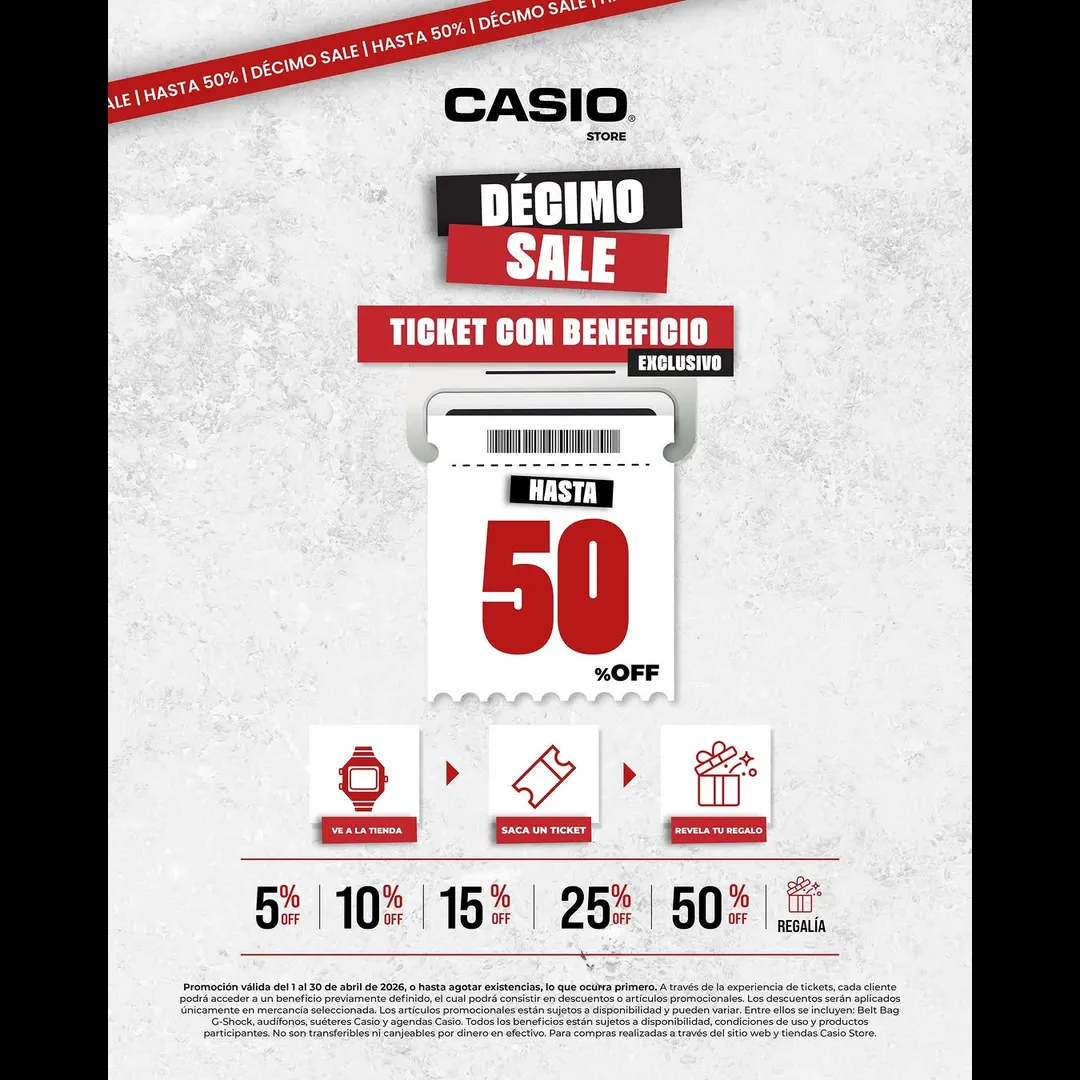 Promoción válida del 1 al 30 de abril de 2026, o hasta agotar existencias, lo que ocurra primero. A través de la experiencia de tickets, cada cliente podrá acceder a un beneficio previamente definido, el cual podrá consistir en descuentos o artículos promocionales. Los descuentos serán aplicados únicamente en mercancía seleccionada. Los artículos promocionales están sujetos a disponibilidad y pueden variar. Entre ellos se incluyen: Belt Bag G-Shock, audífonos, suéteres Casio y agendas Casio. Todos los beneficios están sujetos a disponibilidad, condiciones de uso y productos participantes. No son transferibles ni canjeables por dinero en efectivo. Para compras realizadas a través del sitio web y tiendas Casio Store.