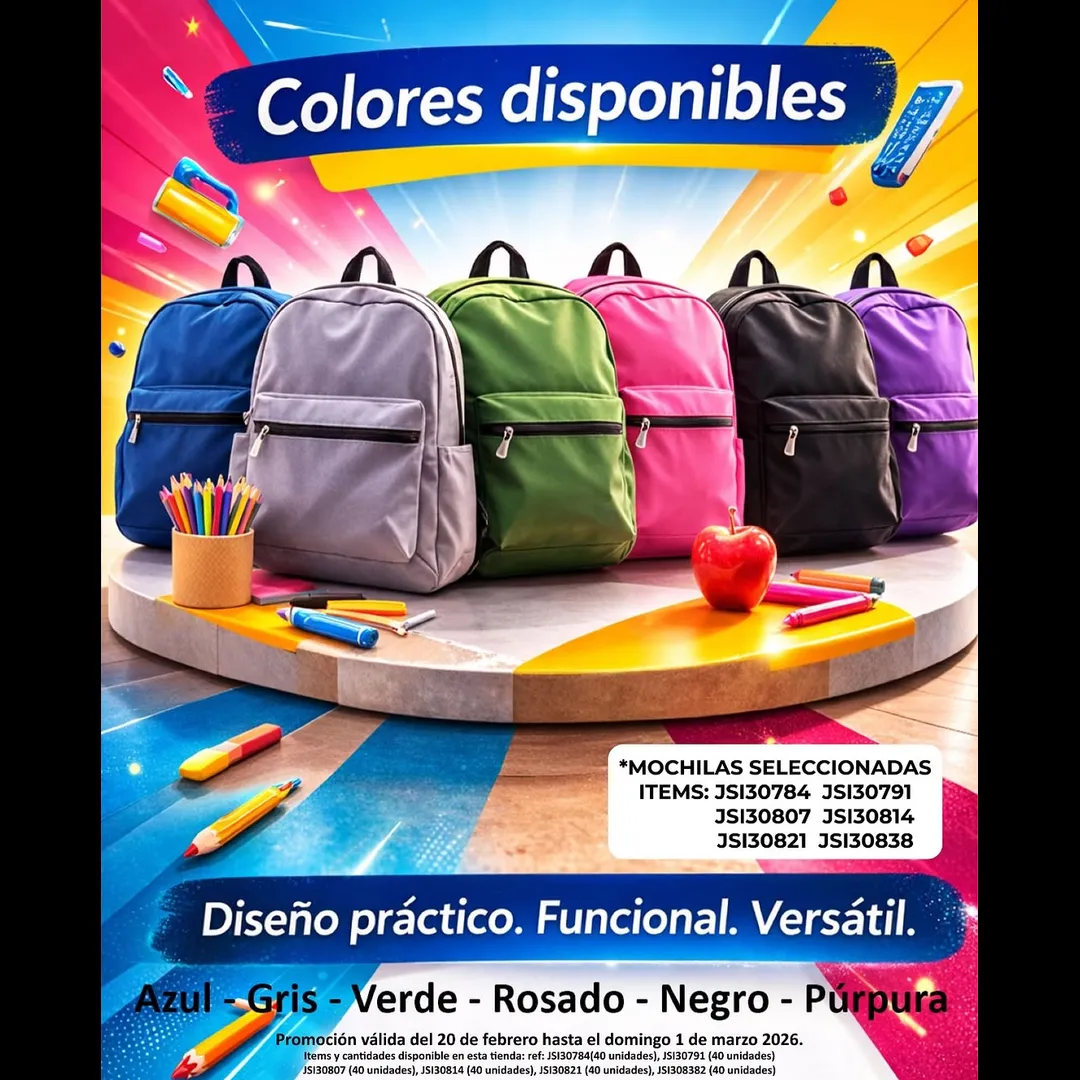 Válido únicamente con las mochilas que tenga los siguientes items JSI30784 JSI30791 JSI30807 JSI30814 JSI30821 JSI30838