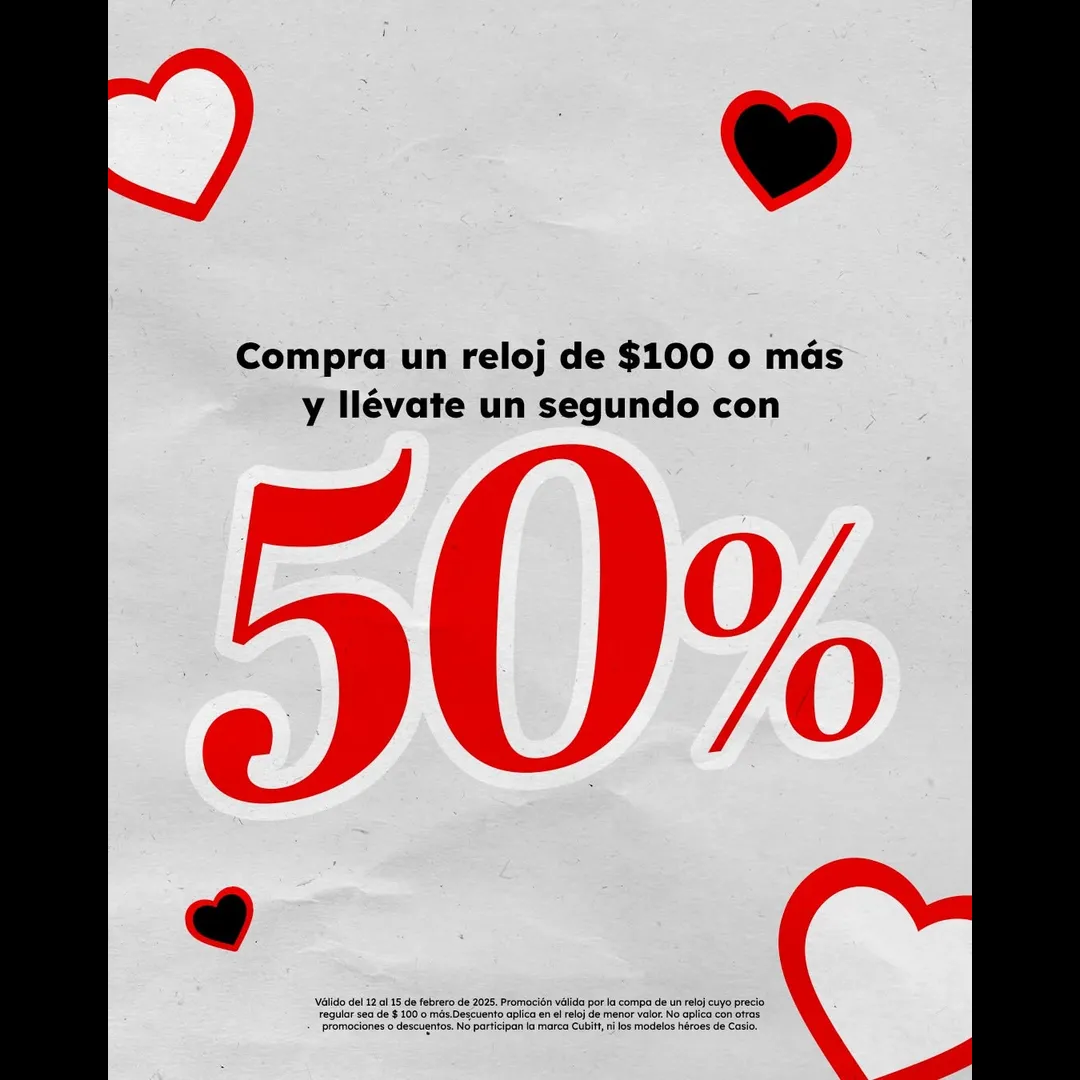 *Válido del 12 al 15 de febrero de 2025. Promoción válida por la compa de un reloj cuyo precio regular sea de $ 100 o más.Descuento aplica en el reloj de menor valor. No aplica con otras promociones o descuentos. No participan la marca Cubitt, ni los modelos héroes de Casio.