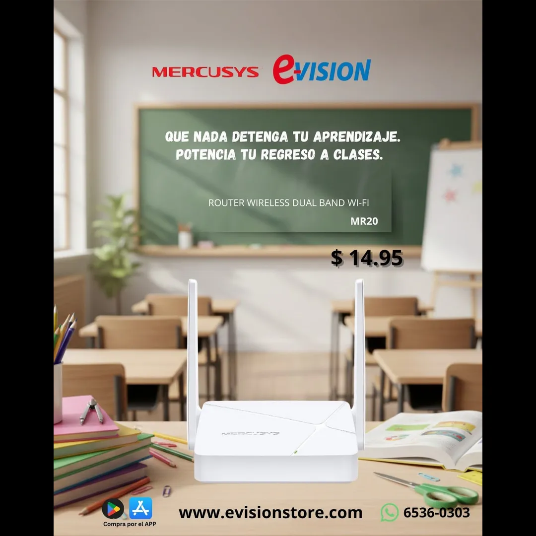 El Router Wireless Dual Band Mercusys MR20 es ideal para tareas, clases virtuales y navegación diaria. Conéctate fácil y mejora tu WiFi por solo $14.95.