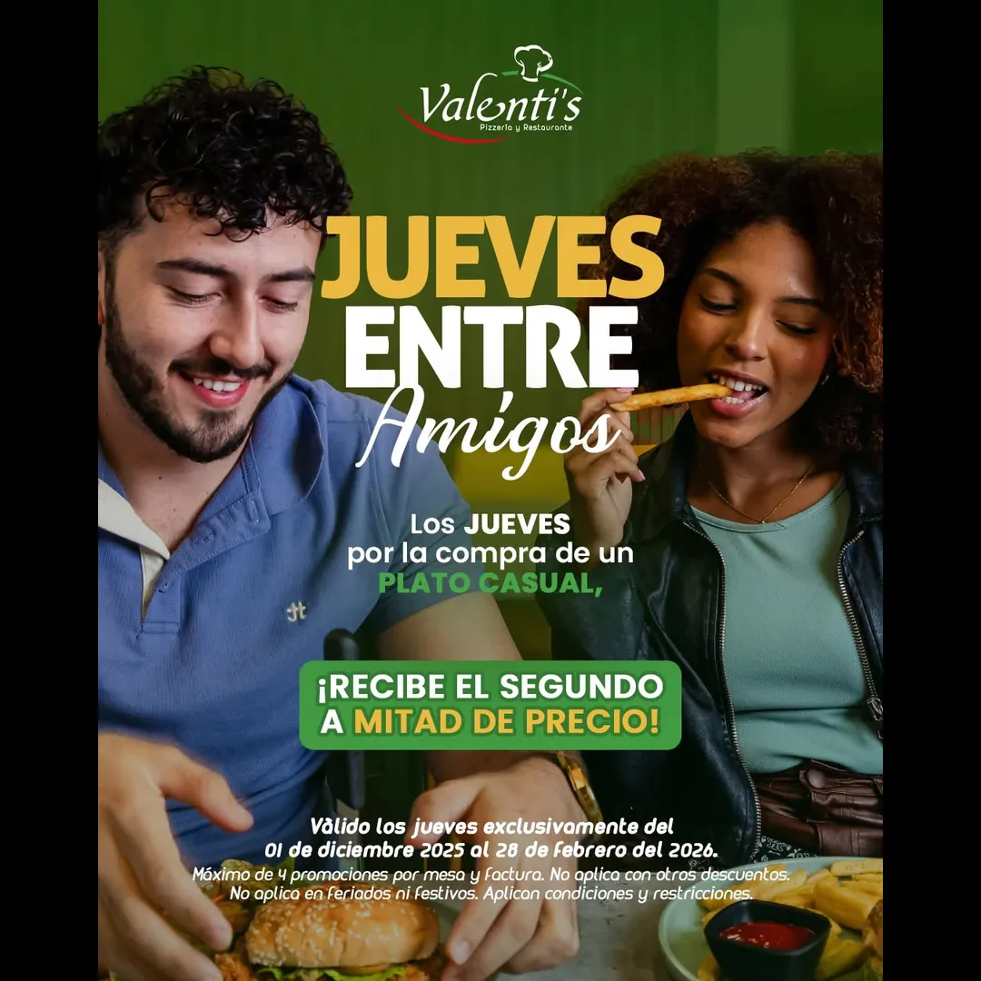 Por la compra de un plato casual, ¡recibes el segundo a mitad de precio! 🍔🍟🍕 Aprovecha este deal para disfrutar de tus favoritos con esa persona especial.
